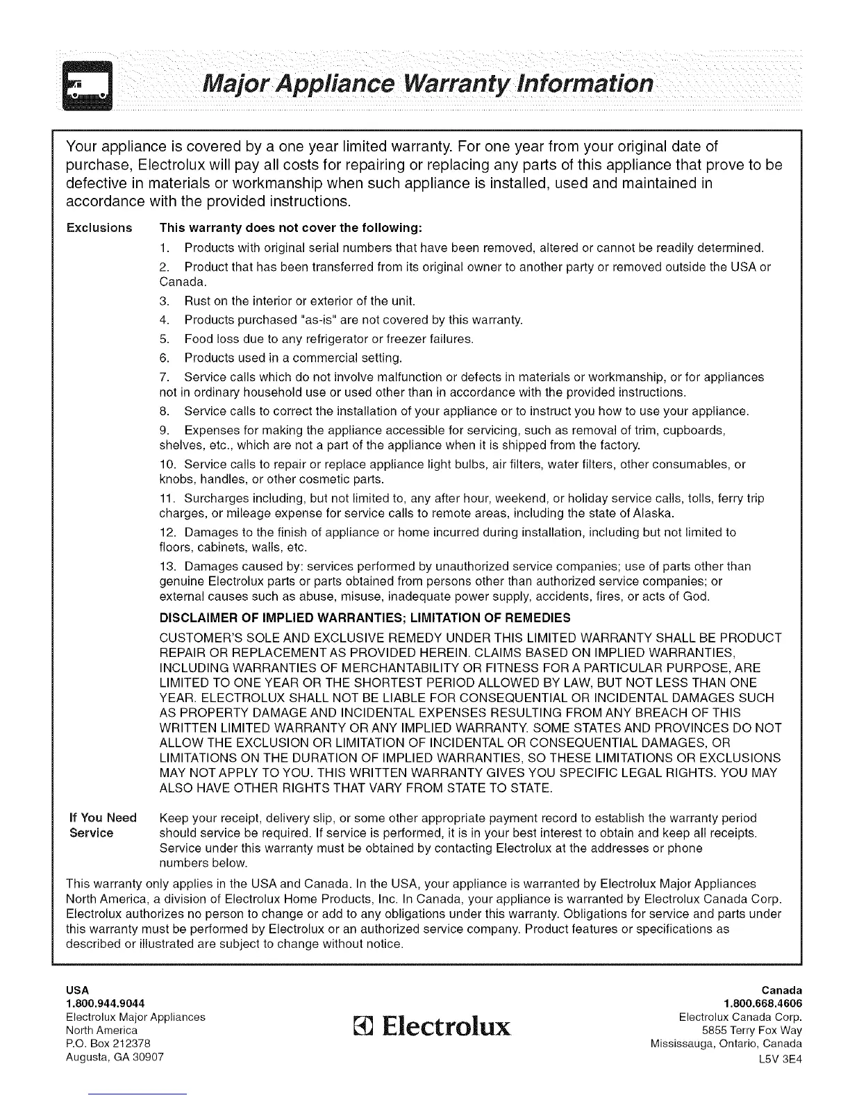 North America, a division of Electrolux Home Products, Inc. In Canada, your appliance is warranted by Electrolux Canada Corp.