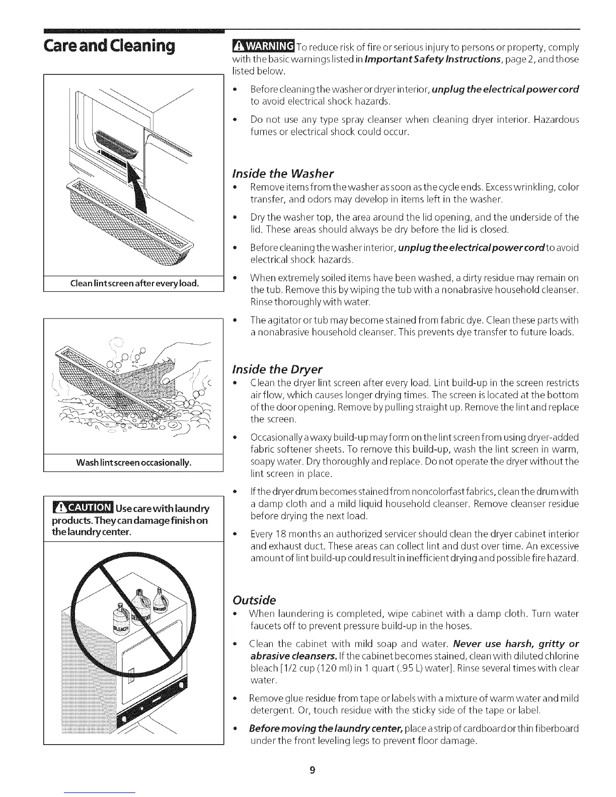 • Beforecleaningthewasherordryerinterior, unplugtheelectricalpowercord