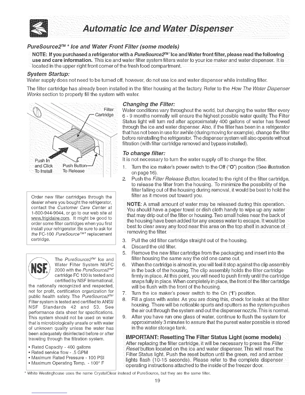 use and care !nformation. This ice and wate_ filter system tinterswater to YOUrice maker and water dispenser. !t is