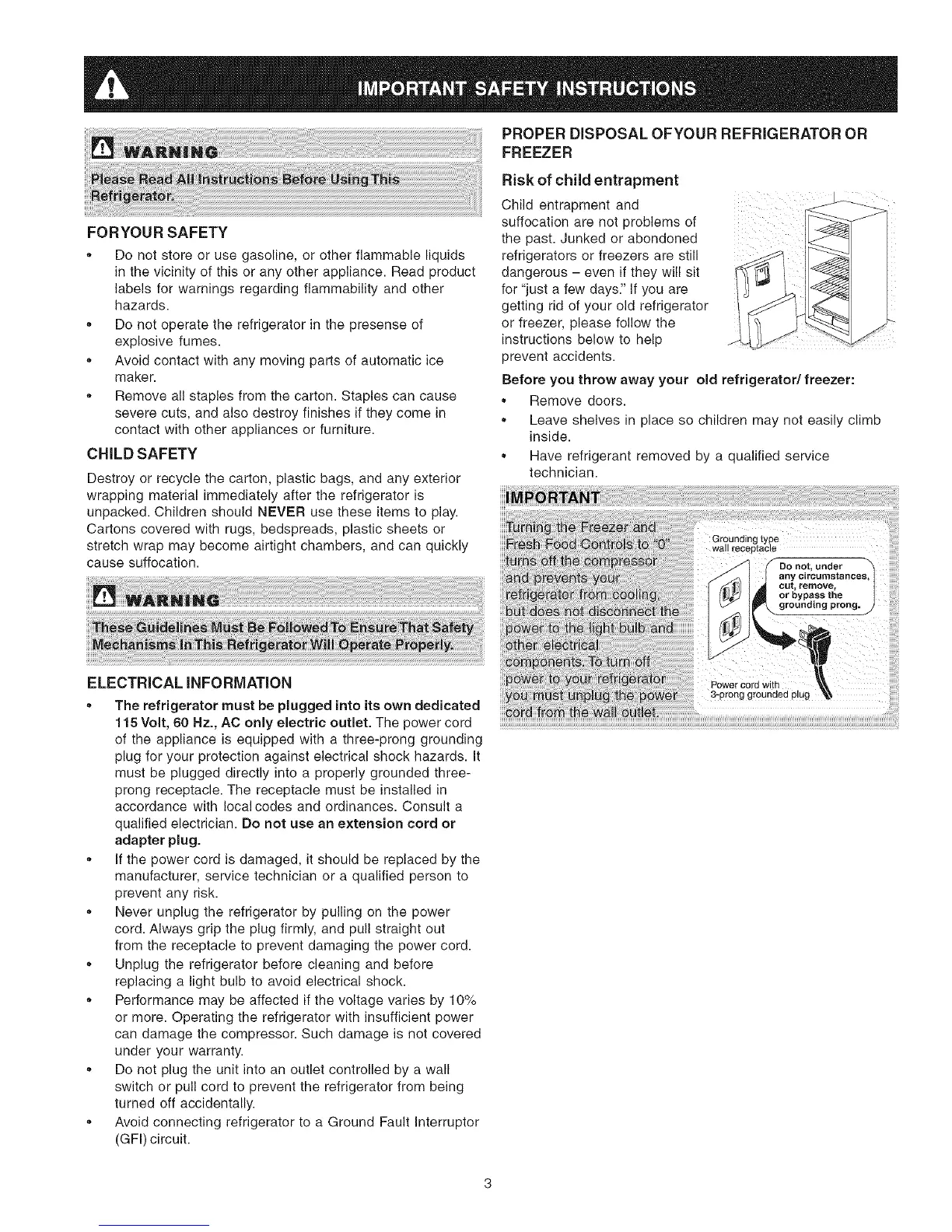 ,, Never unplug the refrigerator by pulling on the power