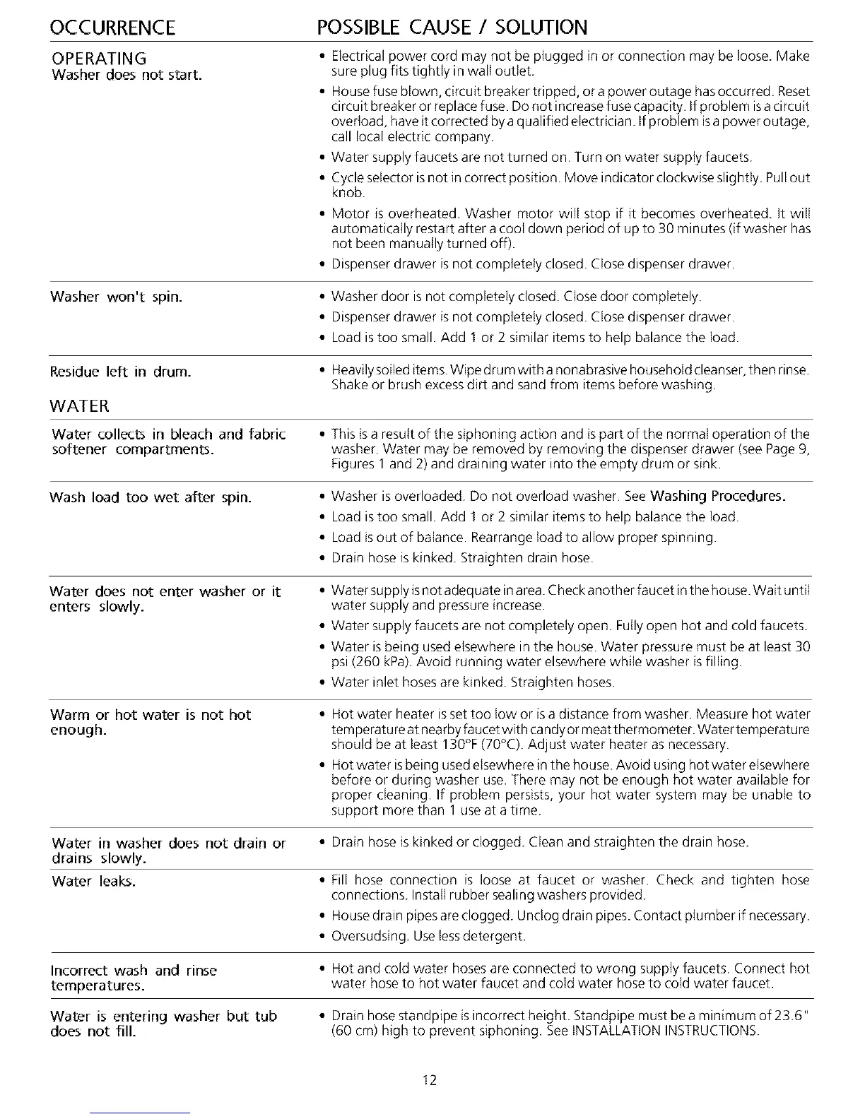 Water is entering washer but tub • Drain hosestandpipeisincorrectheight. Standpipemustbeaminimumof23.6"