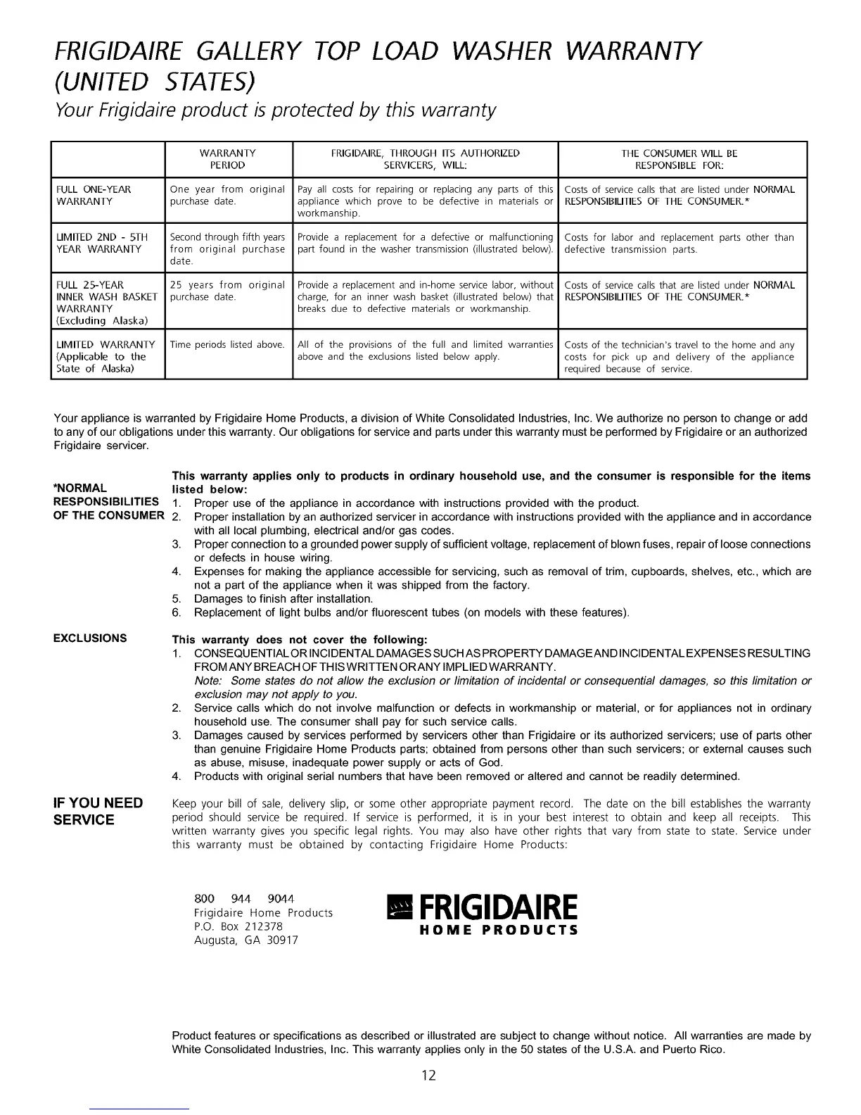 White Consolidated Industries, Inc. This warranty applies only in the 50 states of the U.S.A. and Puerto Rico.