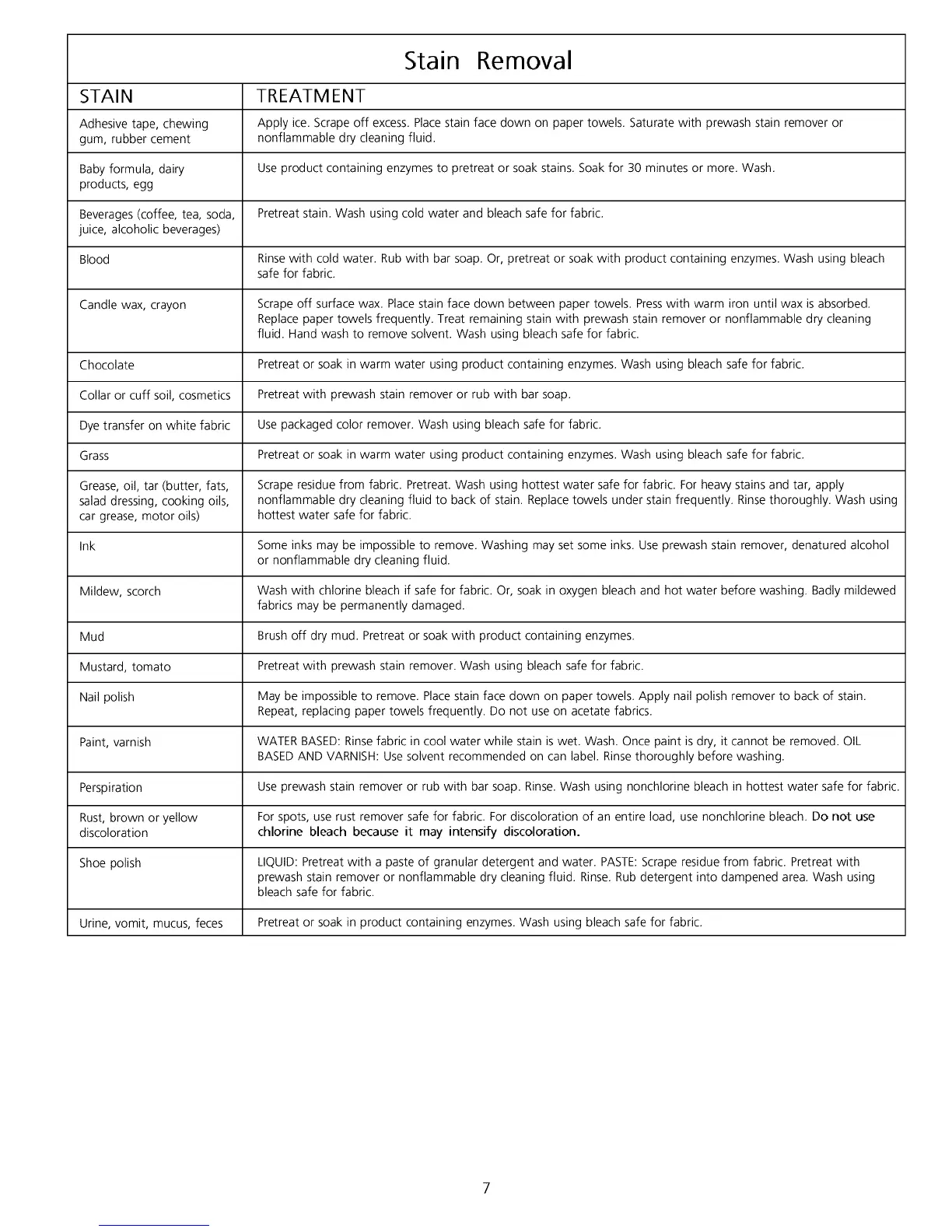 prewash stain remover or nonflammable dry cleaning fluid. Rinse. Rub detergent into dampened area. Wash using