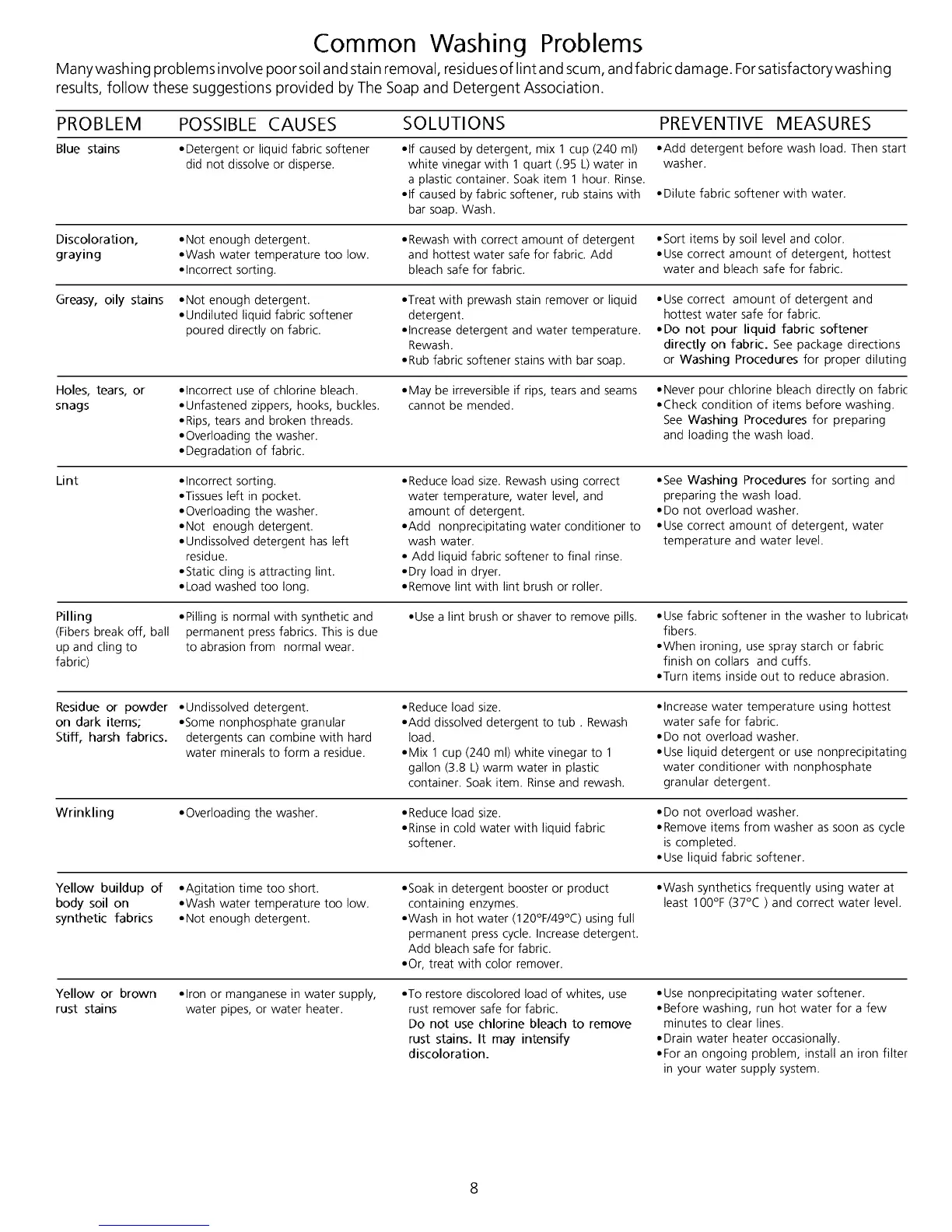 Manywashing problems involve poor soiland stain removal, residuesof lint and scum, and fabric damage. Forsatisfactorywashi ng