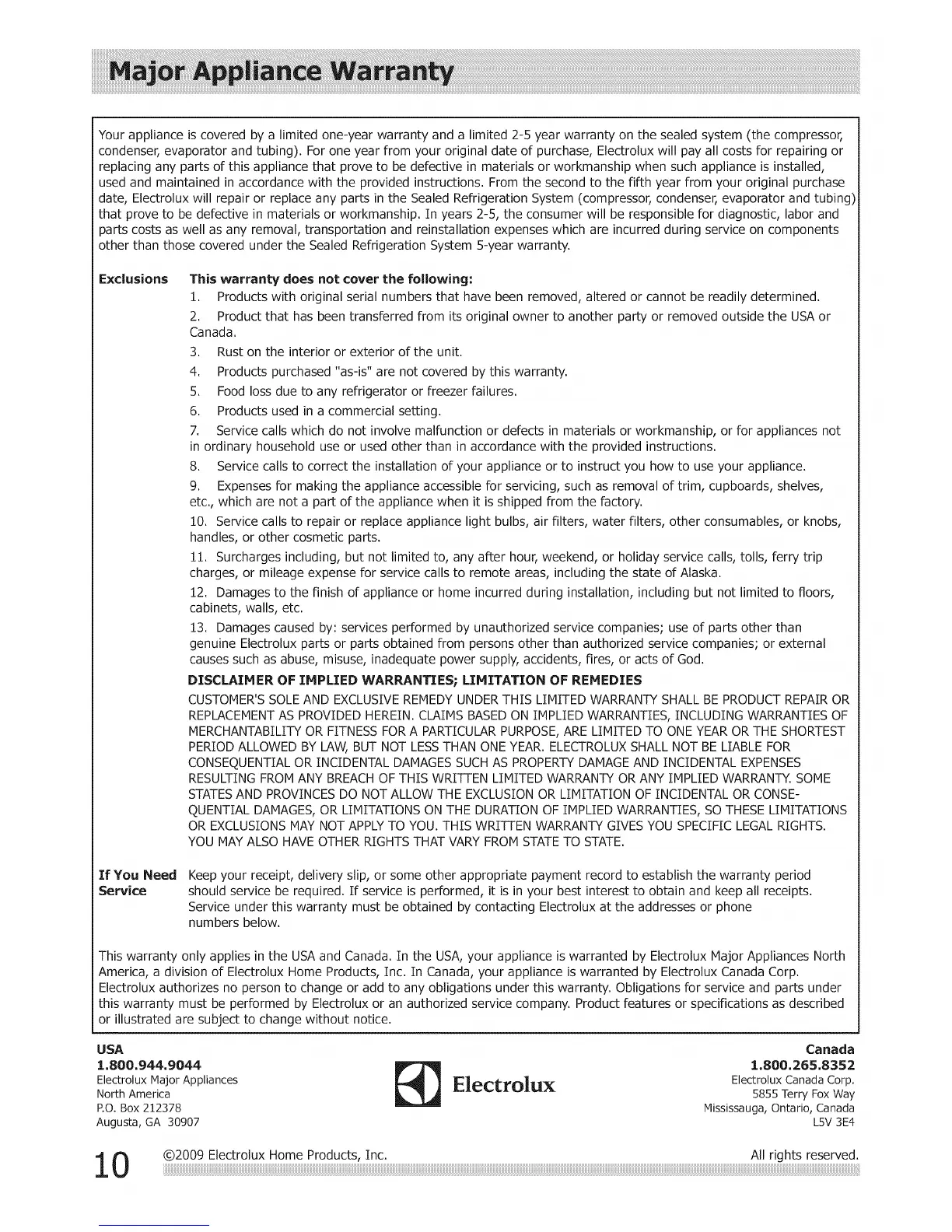 America, a division of Electrolux Home Products, Inc. In Canada, your appliance is warranted by Electrolux Canada Corp.
