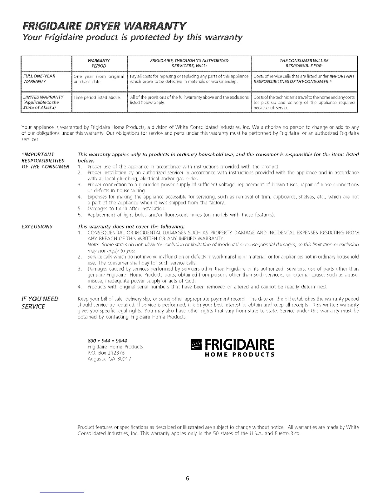 Your appliance is warranted by Frigidaire Home Products, a division of White Consolidated industries, Inc. We authorize no person to change or add to any