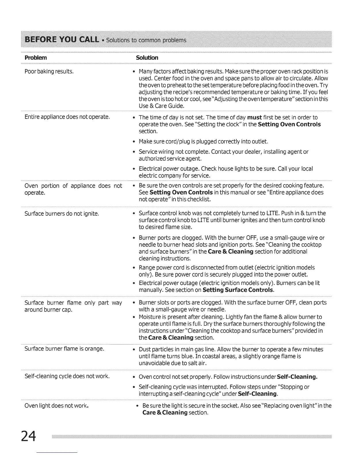 Surface burners do not ignite, o Surface control knob was not completely turned to LITE. Push in &turn the