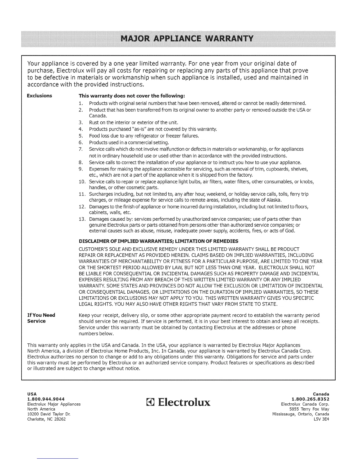 North America, a division of Electrolux Home Products, Inc. In Canada, your appliance is warranted by Electrolux Canada Corp.