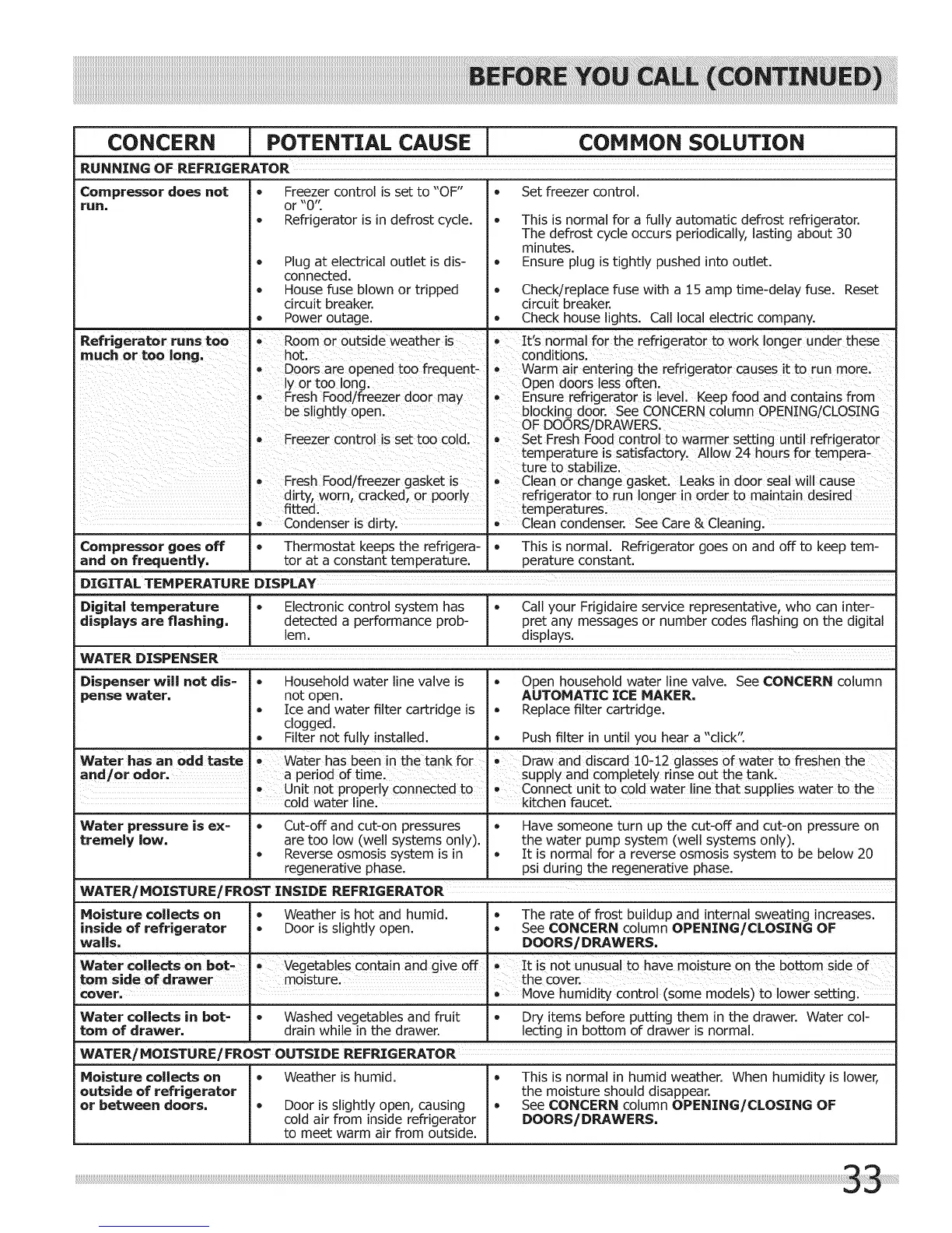 Digital temperature * Electronic control system has | • Call your Frigidaire service representative, who can inter-
