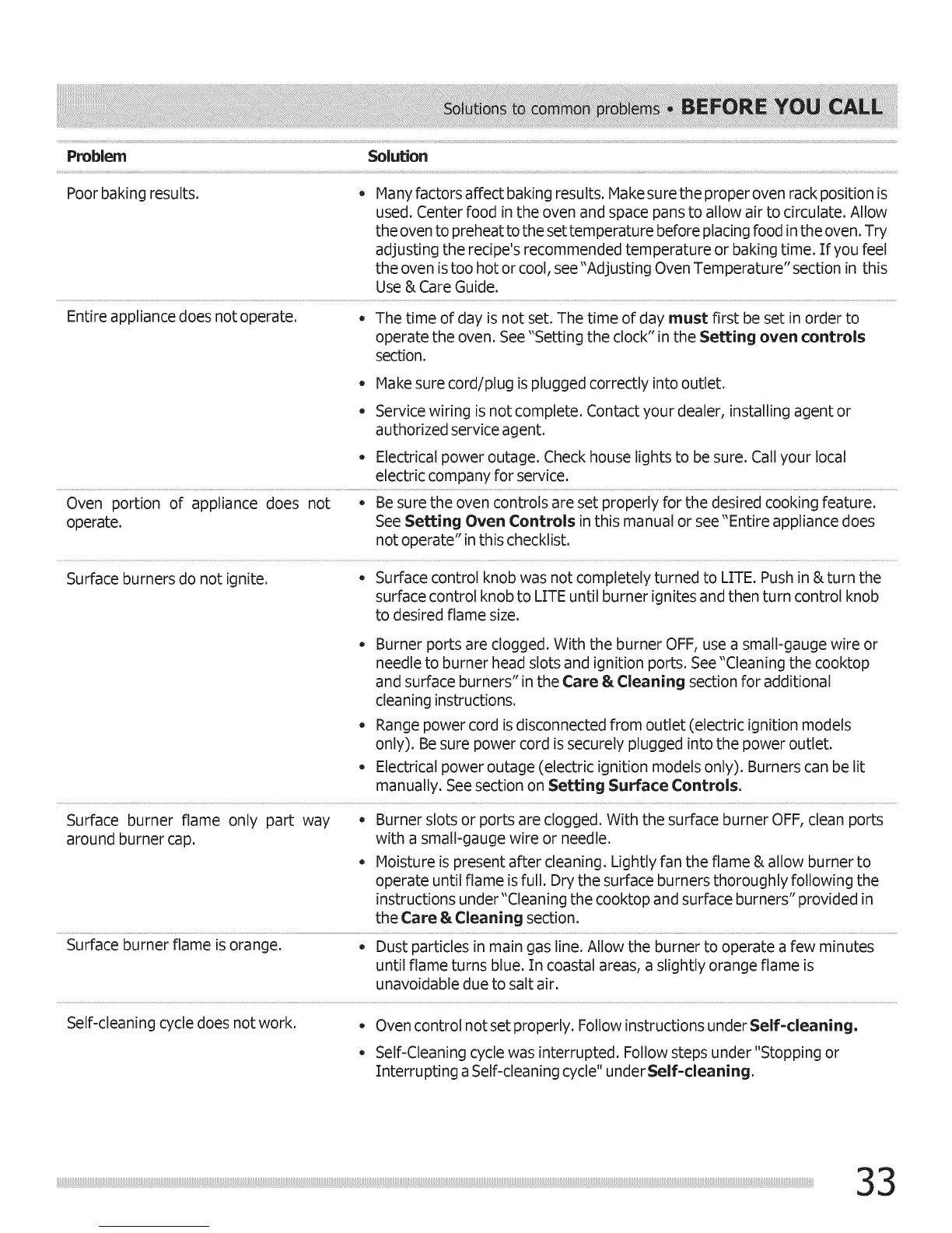 Surface burners do not ignite, o Surface control knob was not completely turned to LITE. Push in &turn the