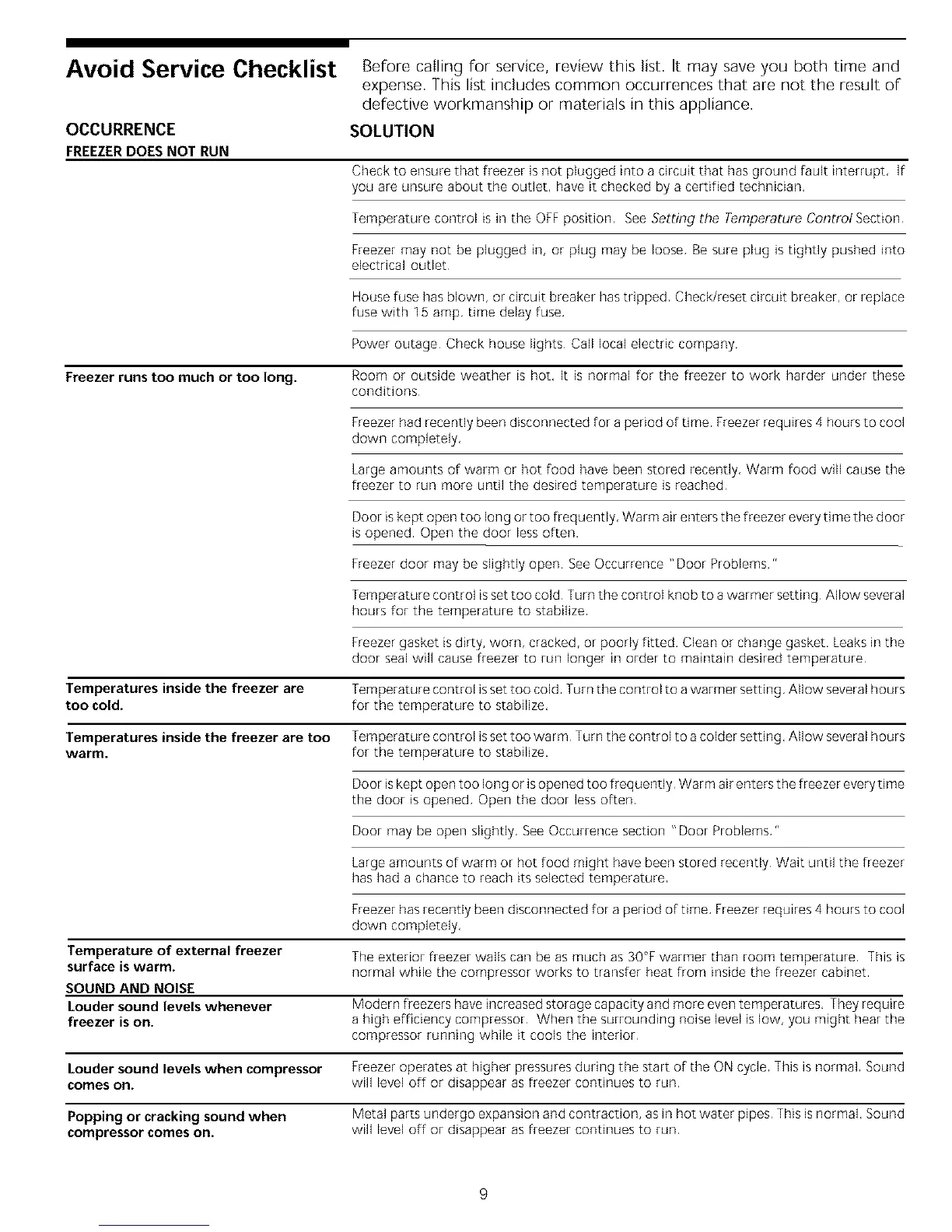 Temperatures inside the freezer are too Temperature control is set too warm Turn the control to a colder setting, Allow several hours