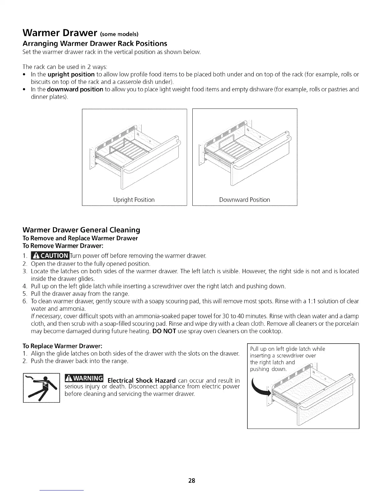 3. Locate the latches on both sides of the warmer drawer. The left latch is visible. However, the right side is not and is located