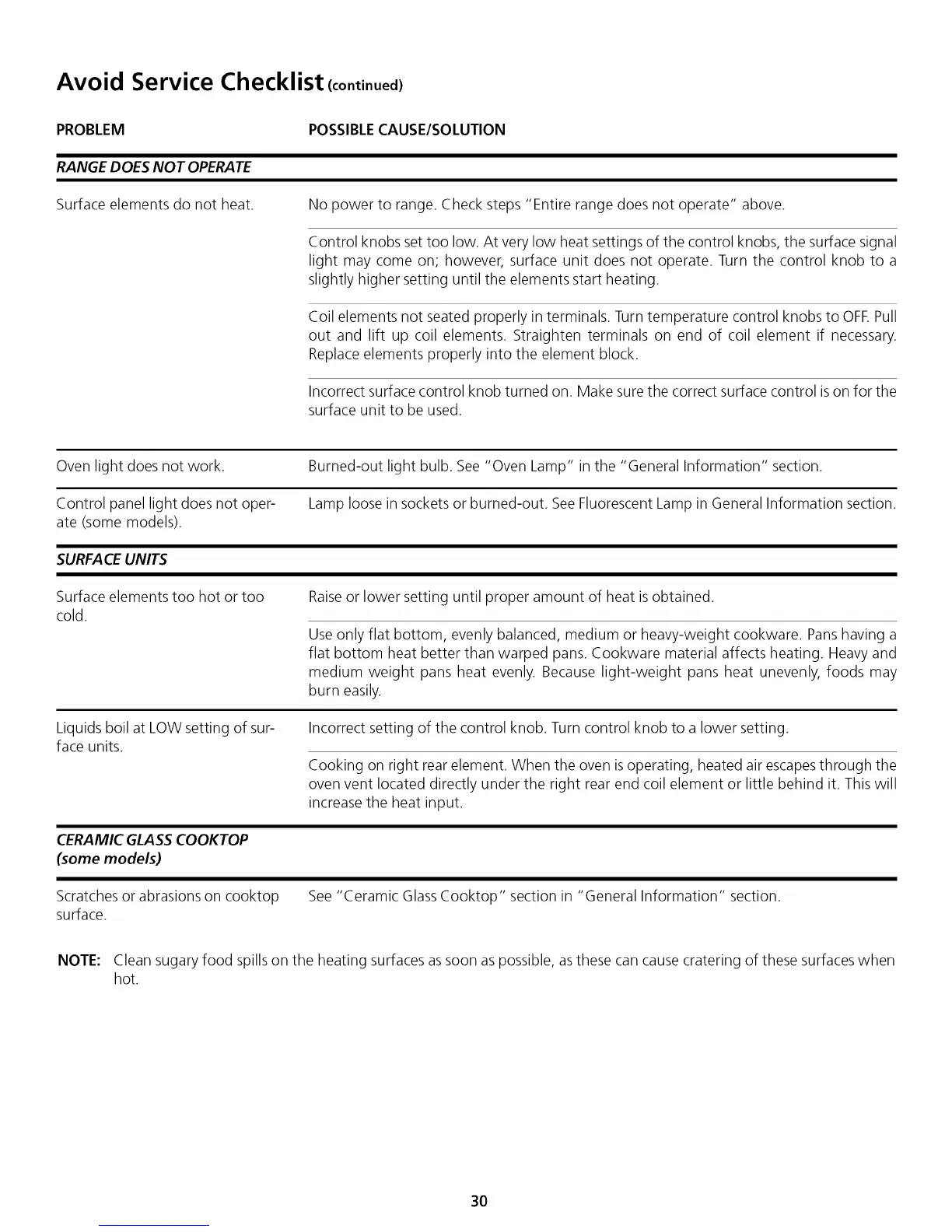 NOTE: Clean sugary food spills on the heating surfaces as soon aspossible, asthese can cause cratering of these surfaces when