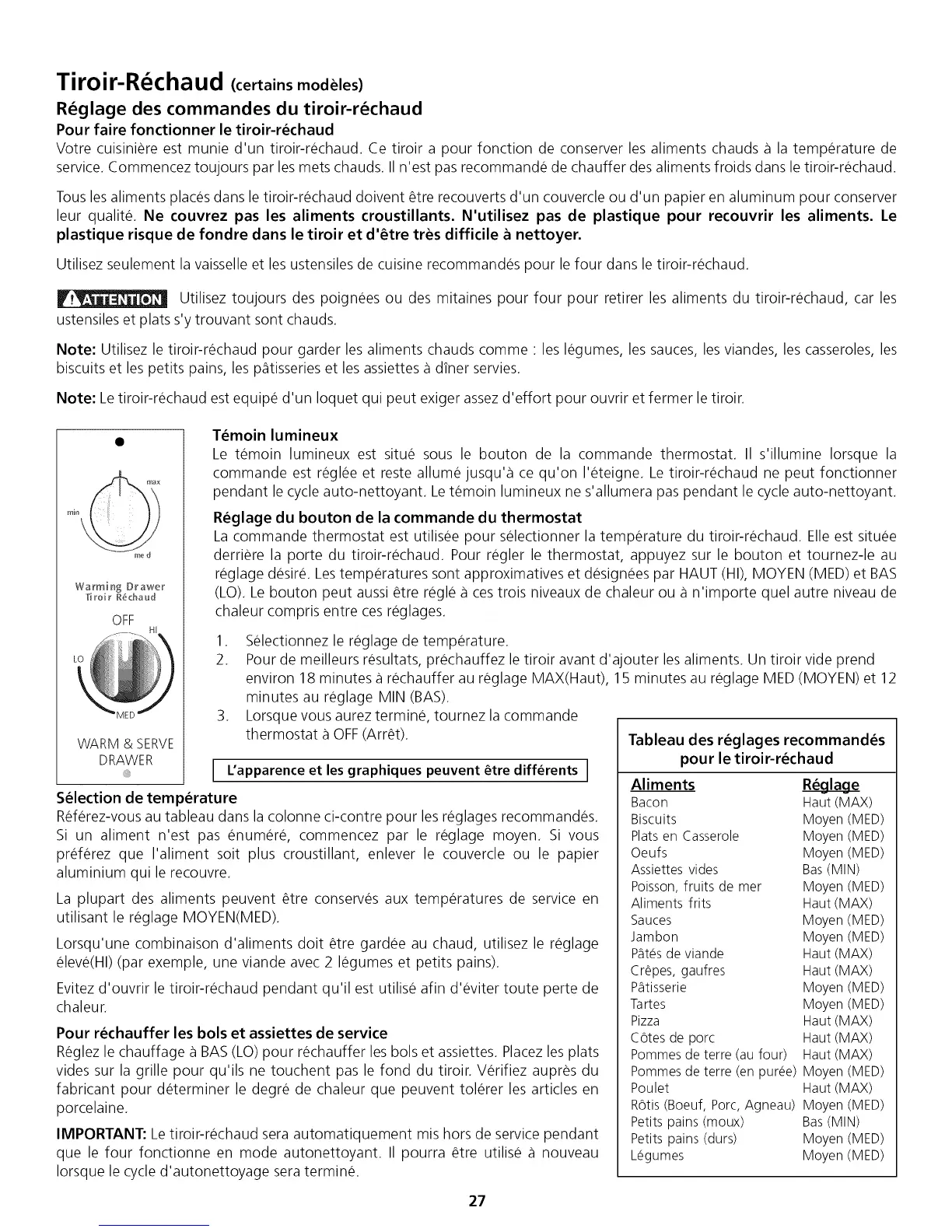 Note: Letiroir-rechaud est equipe d'un Ioquet qui peut exiger assezd'effort pour ouvrir et fermer le tiroir.