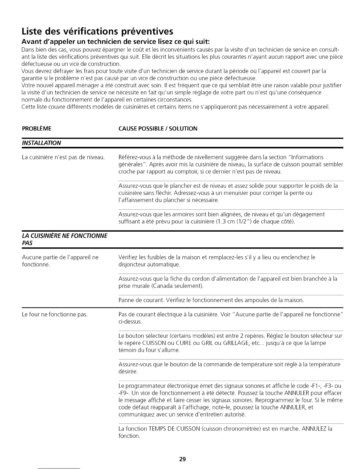 La cuisiniere n'est pas de niveau. Referez-vous a la methode de nivellement suggeree dans la section "lnformations