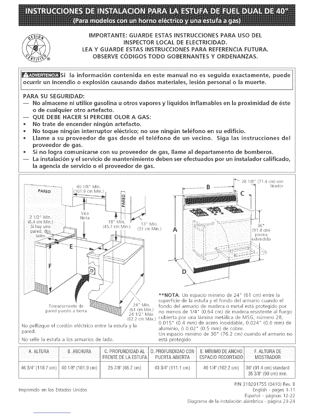 **NOTA: Un espacio minimo de 24" (61 cm) entre la