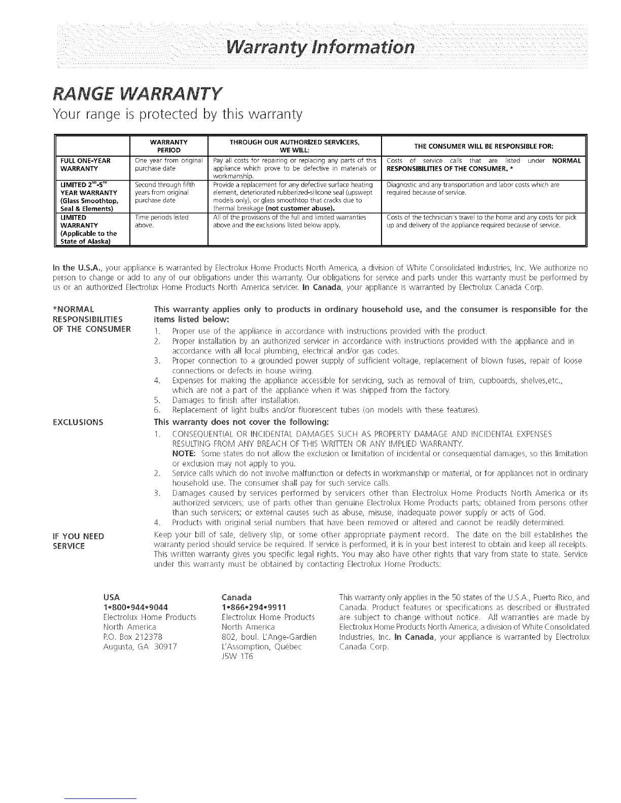 us or an authorized Electro]ux Home Products North America servicer in Canada, your appliance is warranted by Electro]ux Canada Corp,