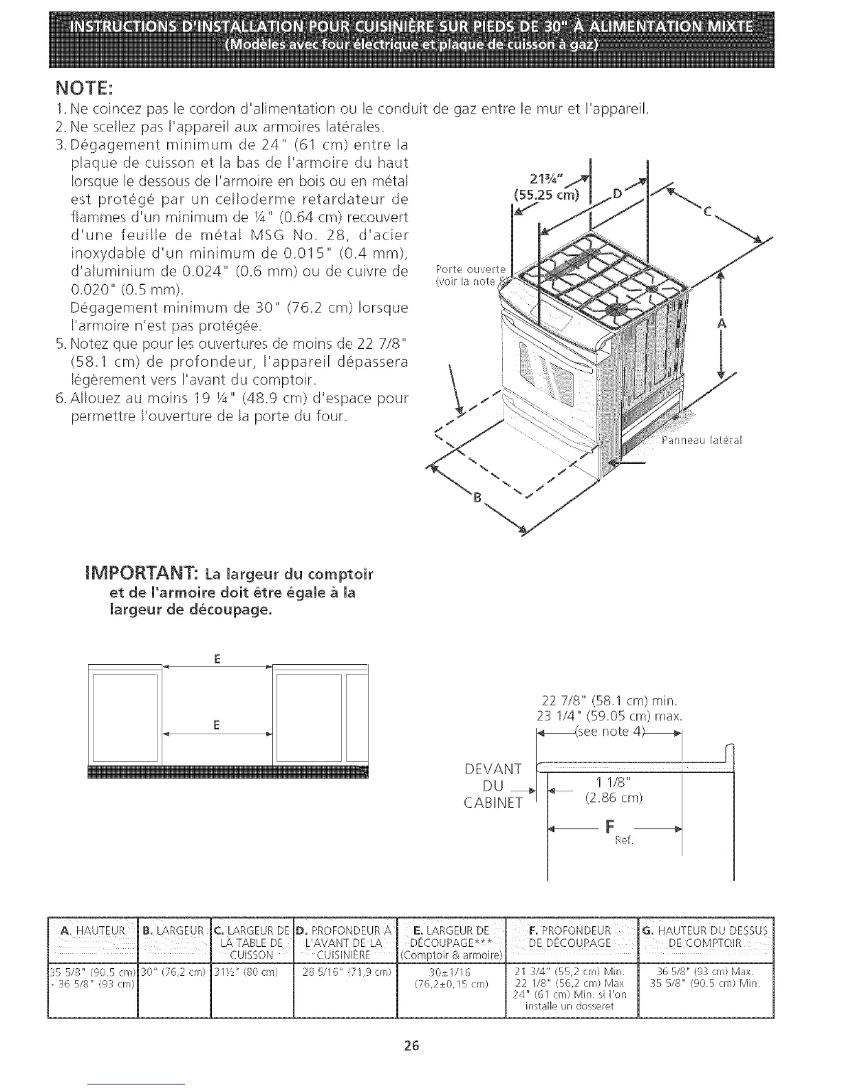Degagement minimum de 30" (76.2 cm) Iorsque