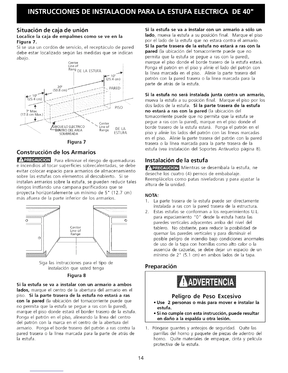 para espaciamiento "0" desde la estufa hasta las