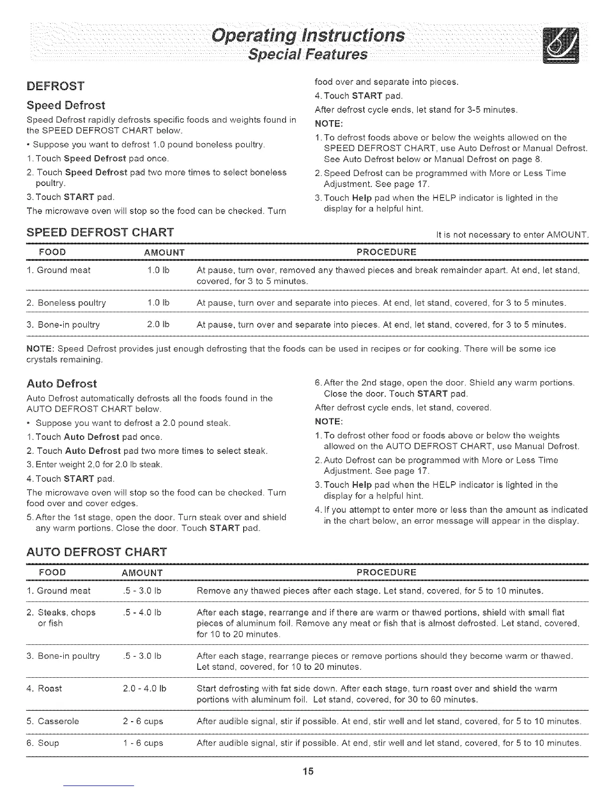 SPEED DEFROST CHART, use Auto Defrost or Manual Defrost.