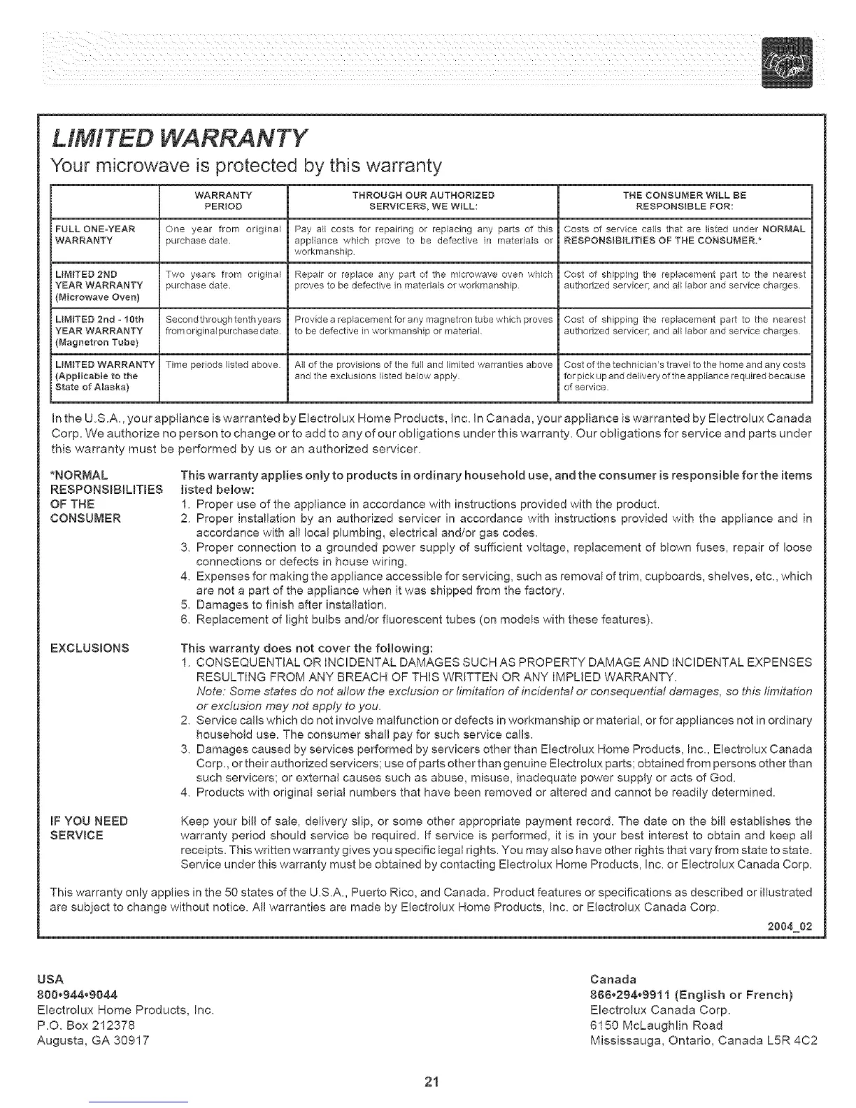 Service under this warranty must be obtained by contacting Electrolux Home Products, Inc. or Electrolux Canada Corp.