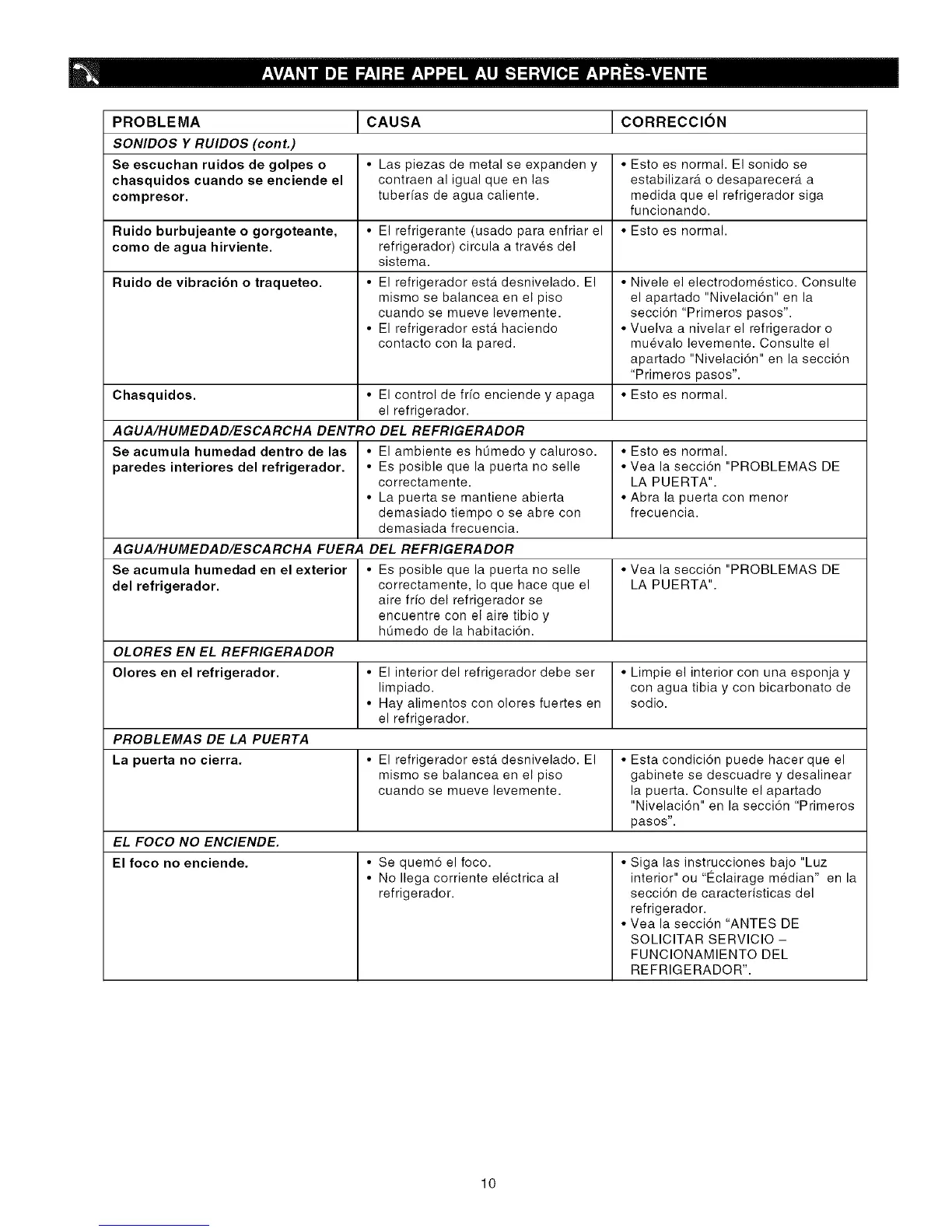 paredes interiores del refrigerador. • Es posible que la puerta no selle • Yea la secci6n "PROBLEMAS DE