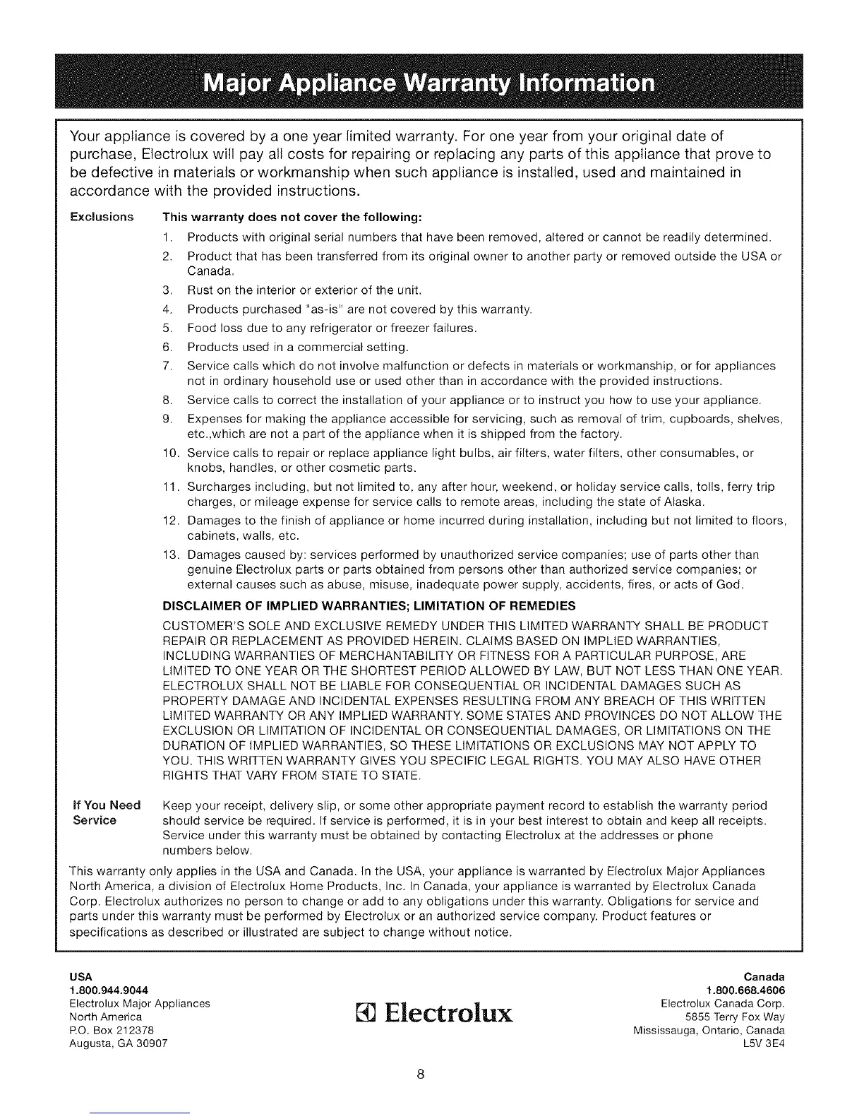 Corp. Electrolux authorizes no person to change or add to any obligations under this warranty. Obligations for service and