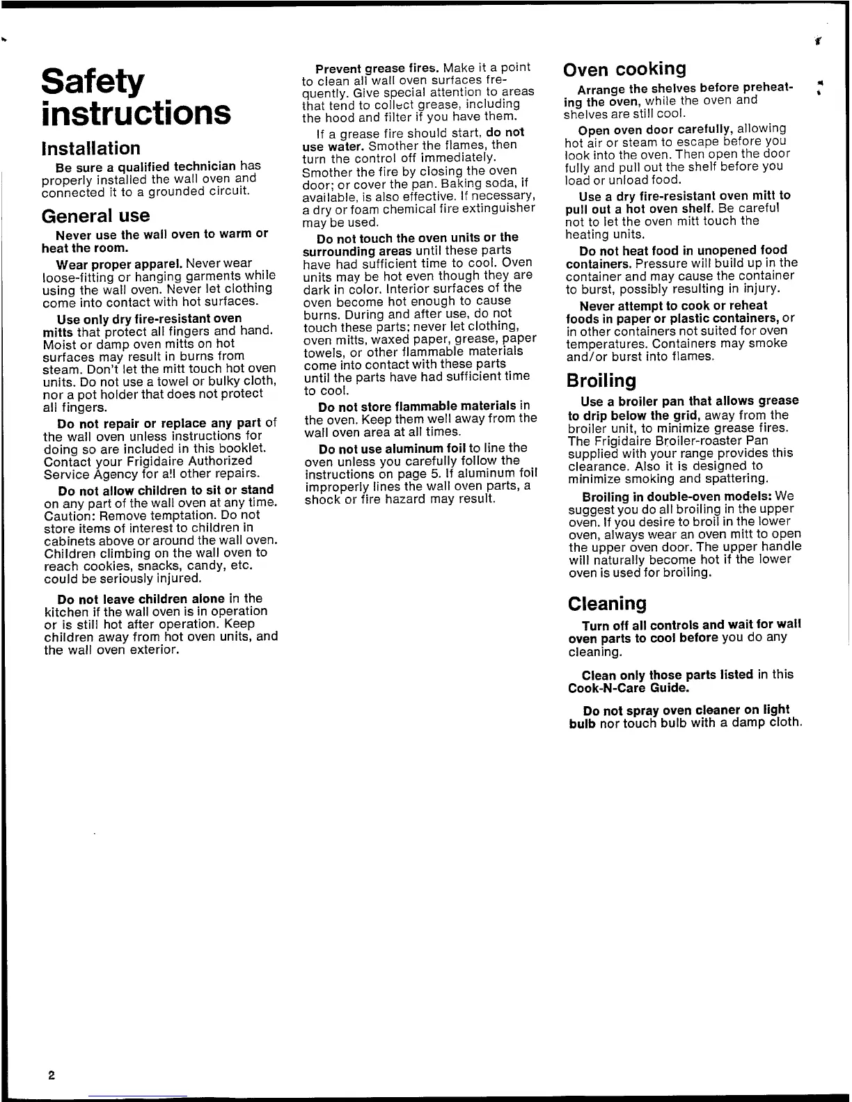 Frigidaire RG-94 - Safety instructions; Installation; General use; Oven cooking safety