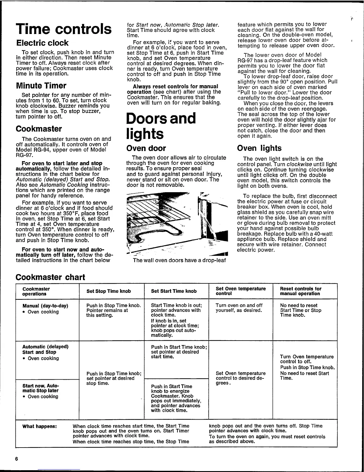 Frigidaire RG-94 - Time controls and Cookmaster; Electric clock operation; Cookmaster automatic operation; Cookmaster chart