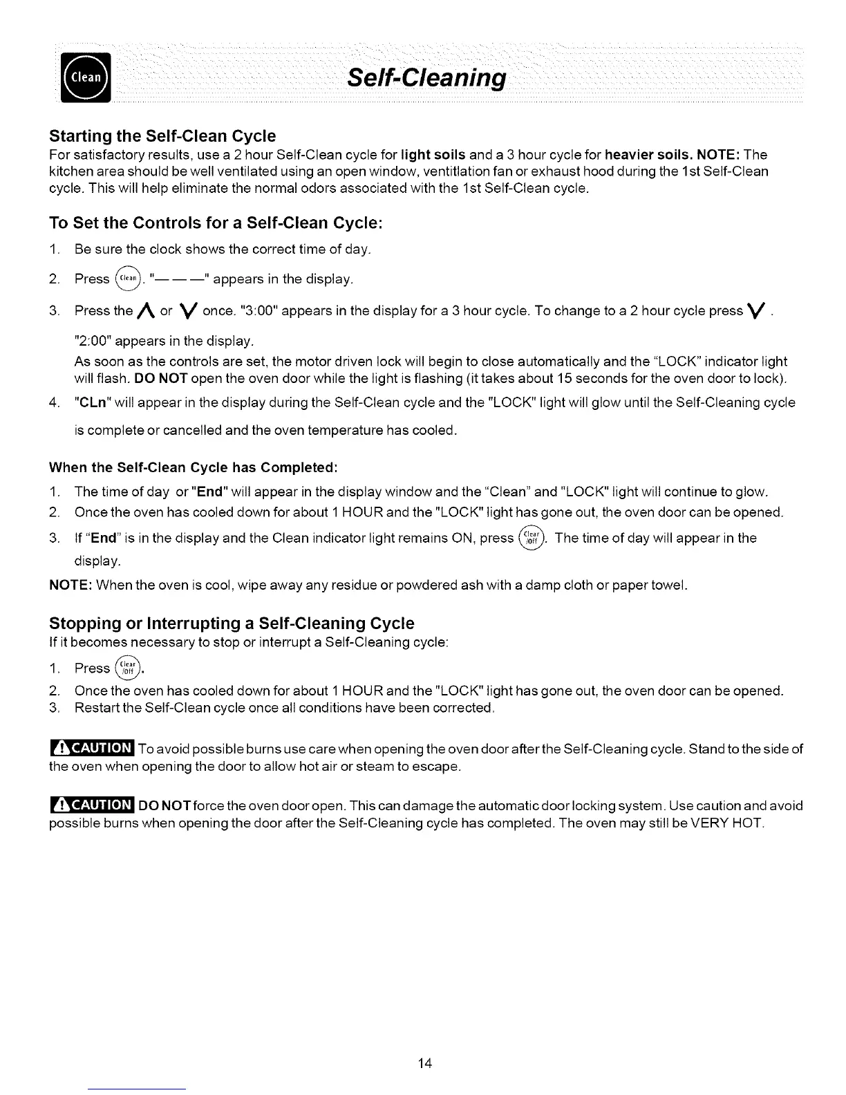 For satisfactory results, use a 2 hour Self-Clean cycle for light soils and a 3 hour cycle for heavier soils. NOTE: The