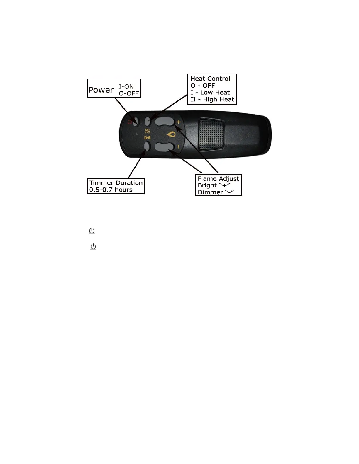 Press either the 〝+〞or 〝-〞button to brighten or dim the flames.