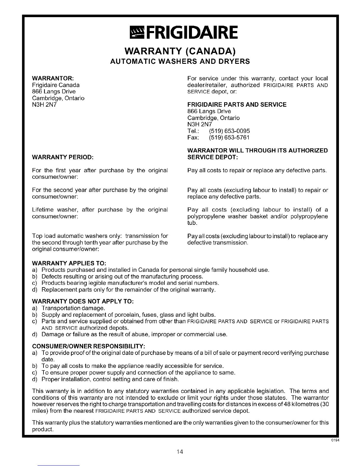 WARRANTY (CANADA)