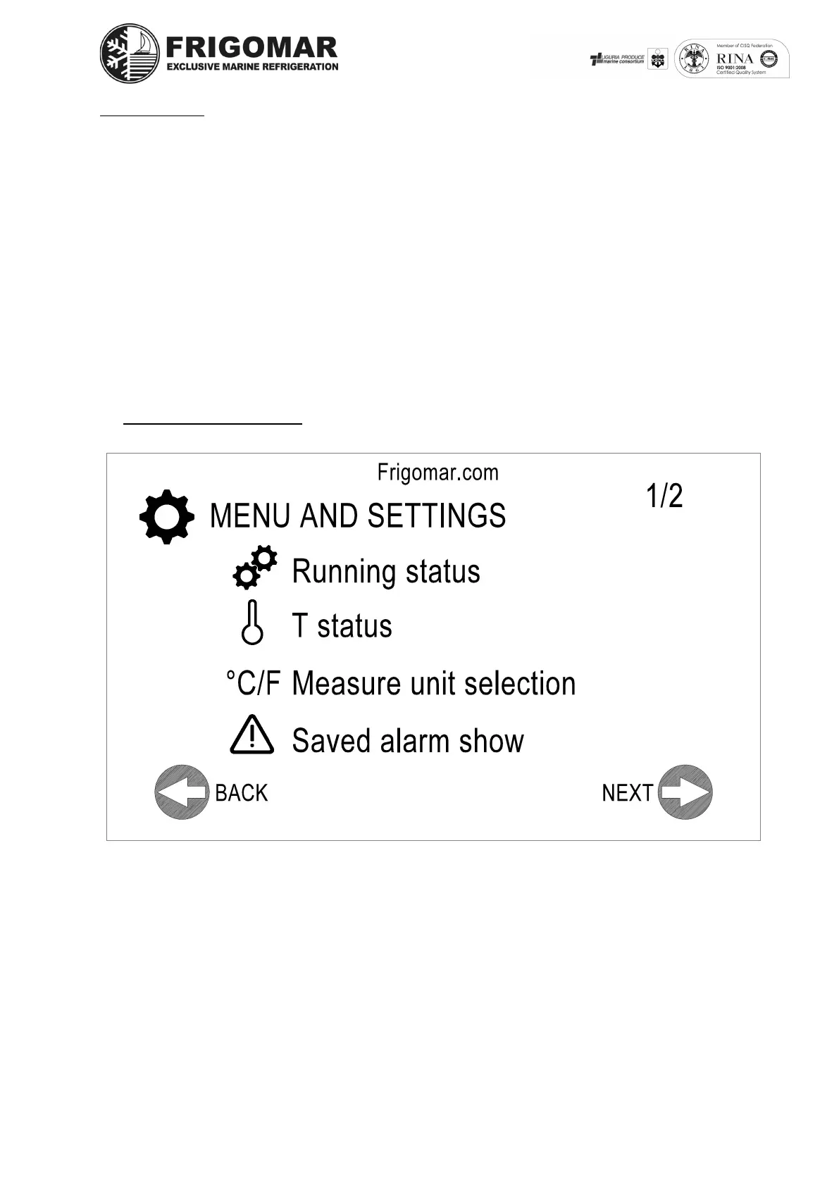 FRIGOMAR CU50VFD - 4.3 PAGE MENU SETTINGS 1;2