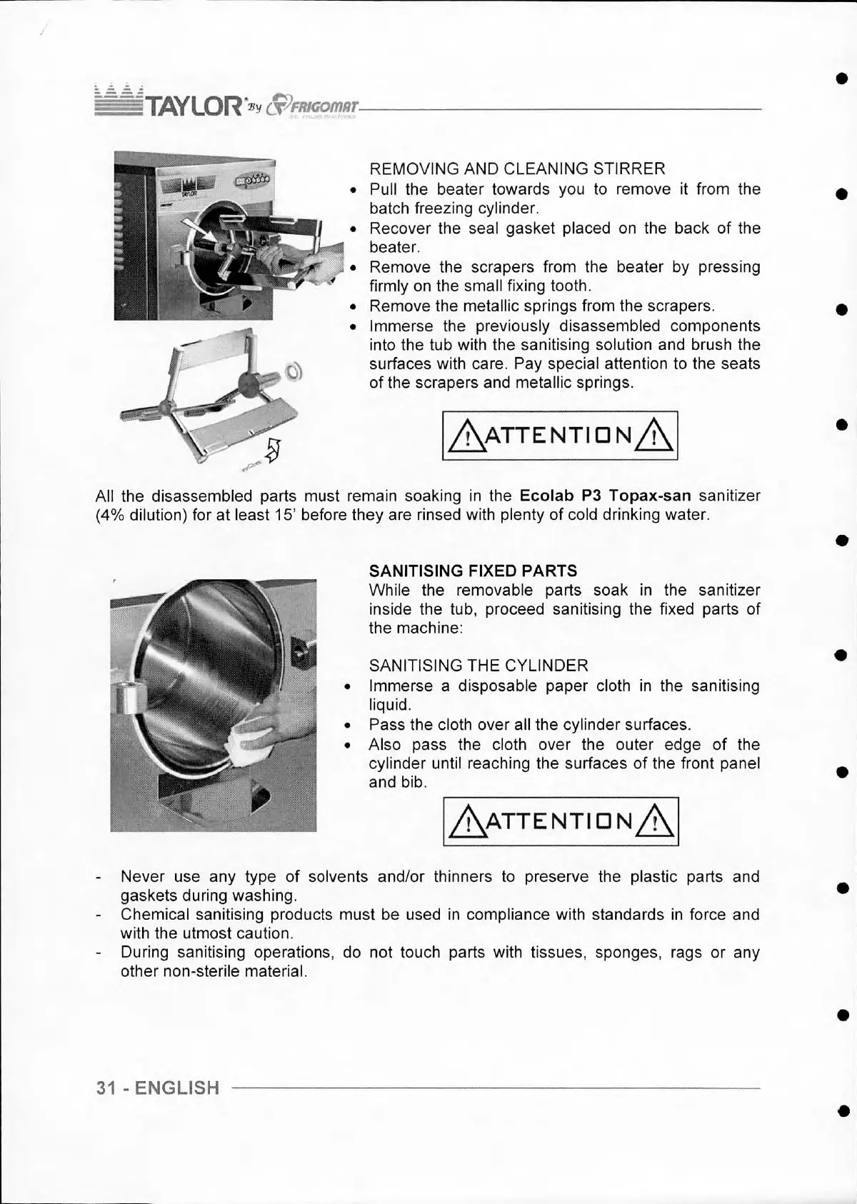 All the disassembled parts must remain soaking in the Ecolab P3 Topax-san sanitizer