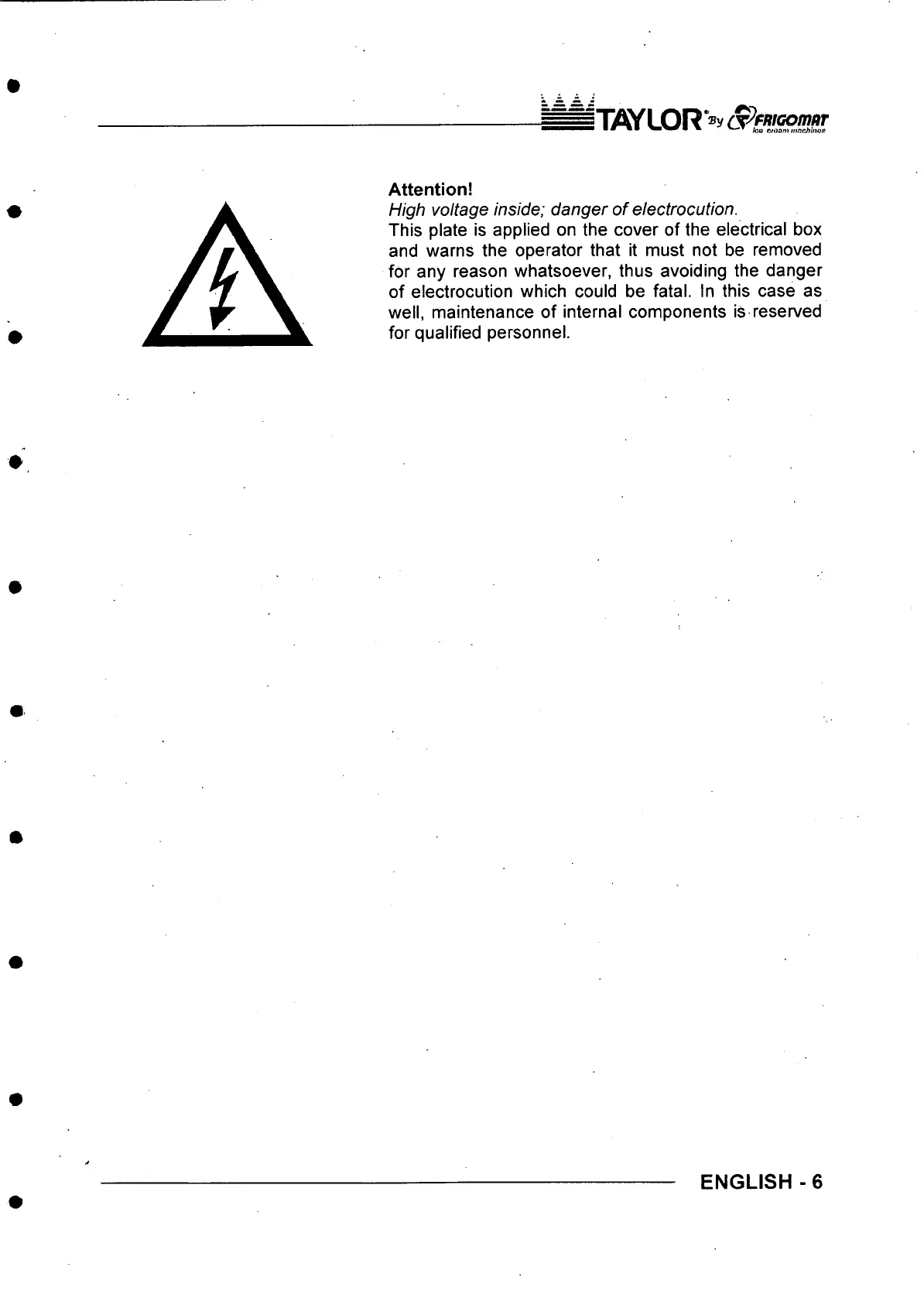 High voltage inside; d a n g e r o f electrocution.