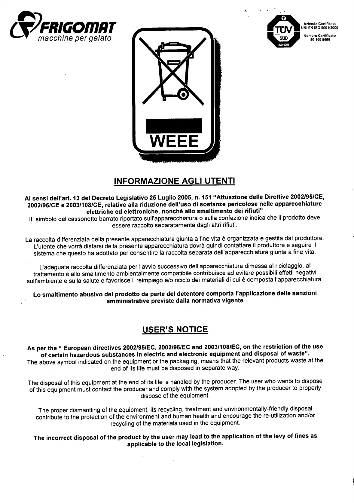 Ai sensi dell’art. 13 del Decreto Legislative 25 Luglio 2005, n. 151 “Attuazione delle Direttive 2002/95/CE,