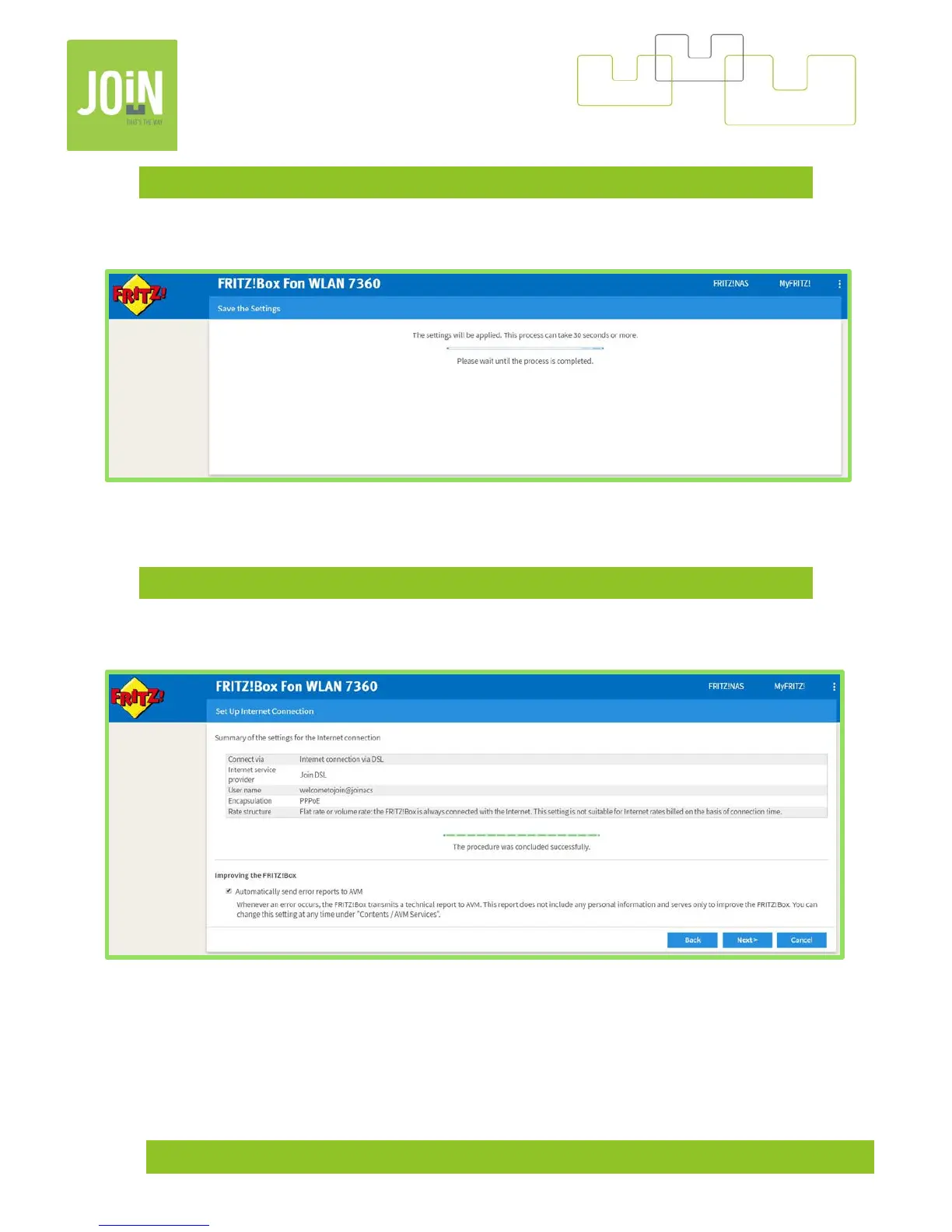 Fritz!Box 7360 - 11- Waiting, Saving Settings; 12- Summary Internet Connection