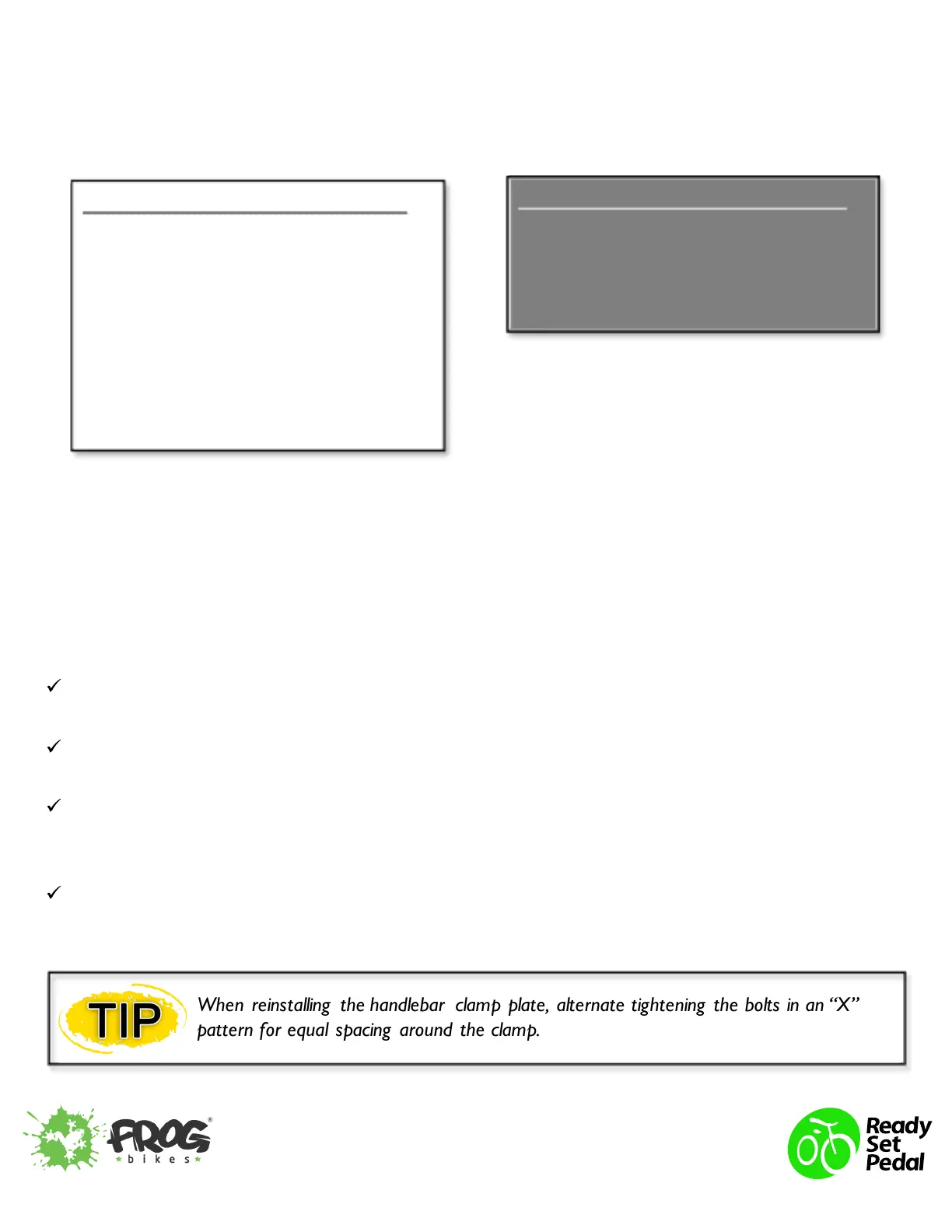 When reinstalling the handlebar clamp plate, alternate tightening the bolts in an “X”
