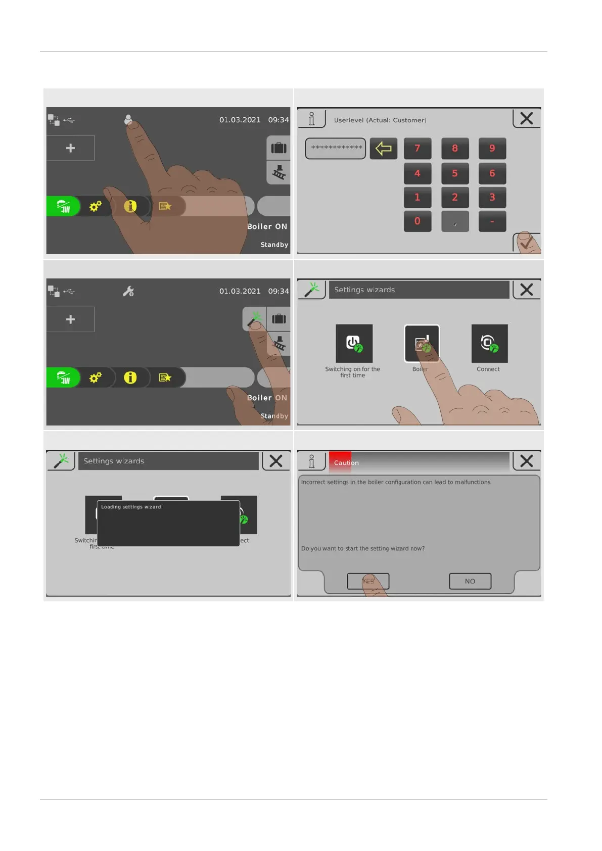 3: Tap the icon of the settings wizard 4: Tap the “Boiler” setting wizard