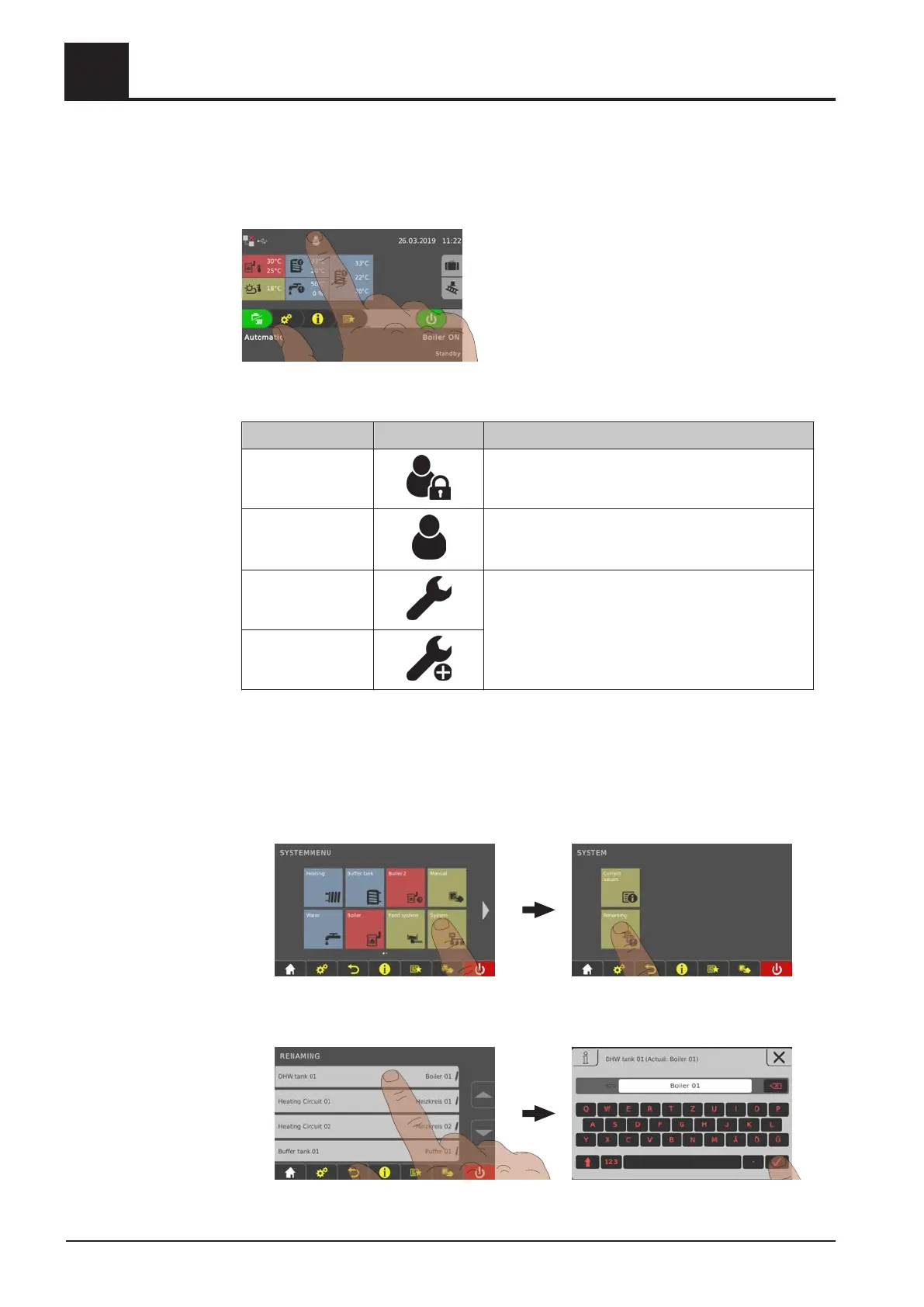❒ Tap on the icon for the user level in the upper area of the basic display and enter