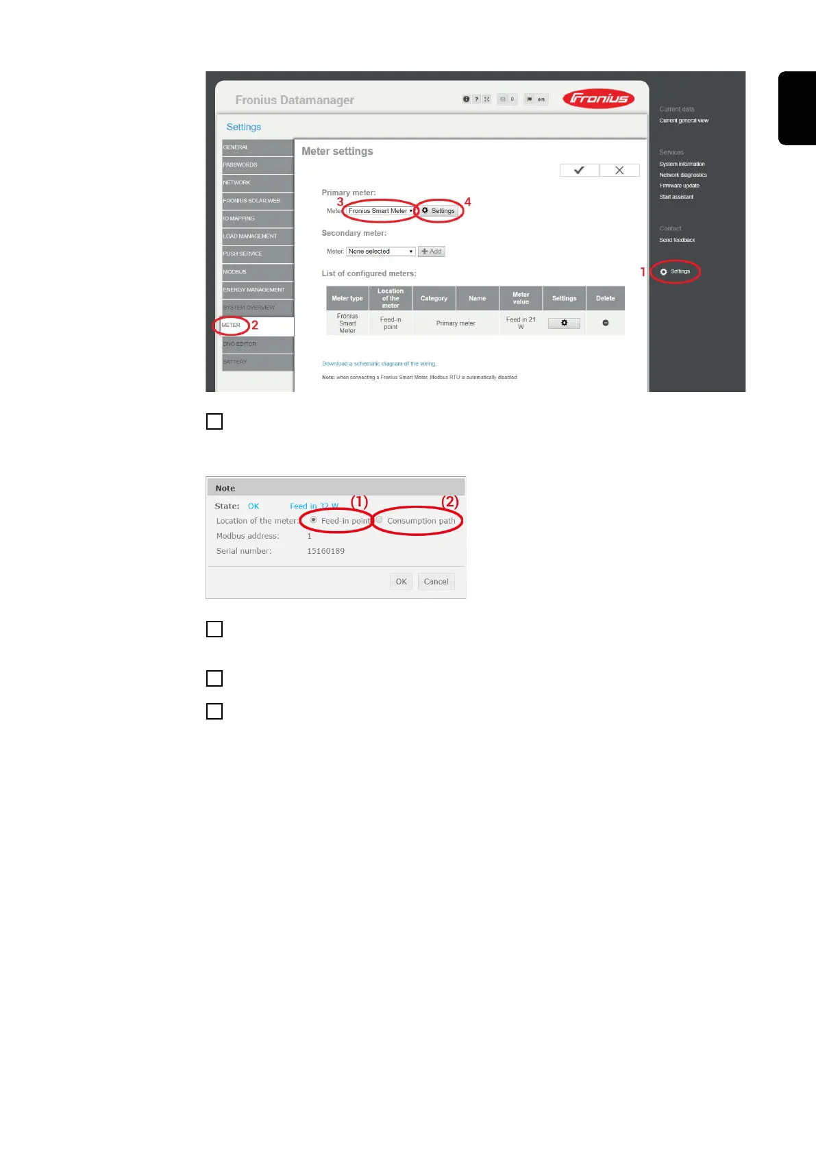 Set the position of the meter – feed-in point (1) or consumption point (2) – in the pop-