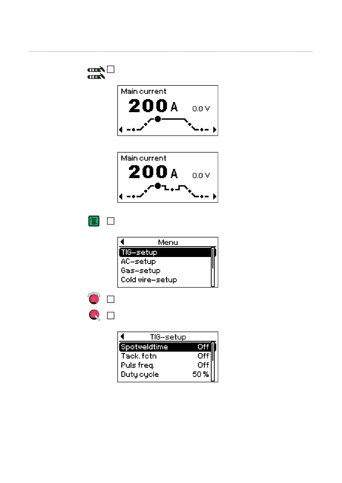 Use the adjusting dial to select "TIG setup" (turn the adjusting dial)