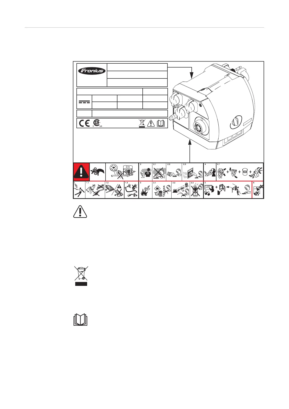 plate must not be removed or painted over. The safety symbols warn against operating the