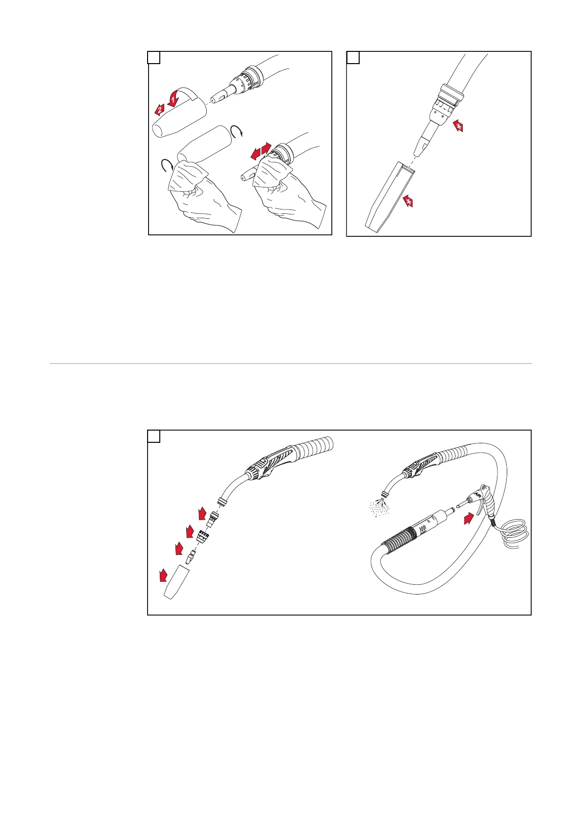 * Comprobar la tobera de gas, la protección antiproyecciones y los aislami-