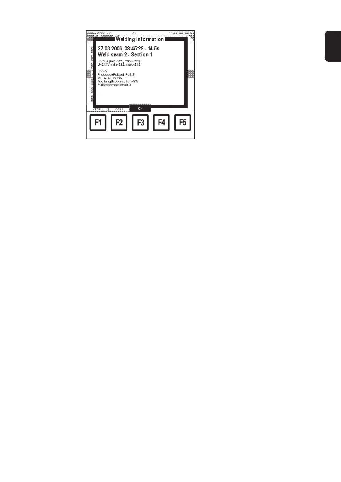 "Welding information" screen for seam 2, section 1