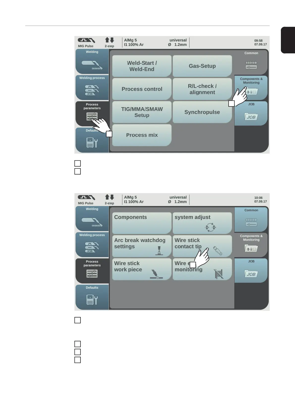 The overview "Wire stick contact tip - setup menu" is displayed.