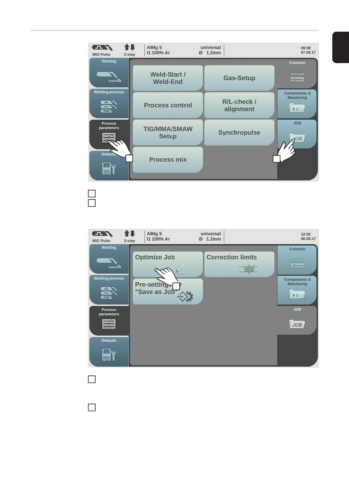 Turn the adjusting dial and select either the job or the job welding parameters to be