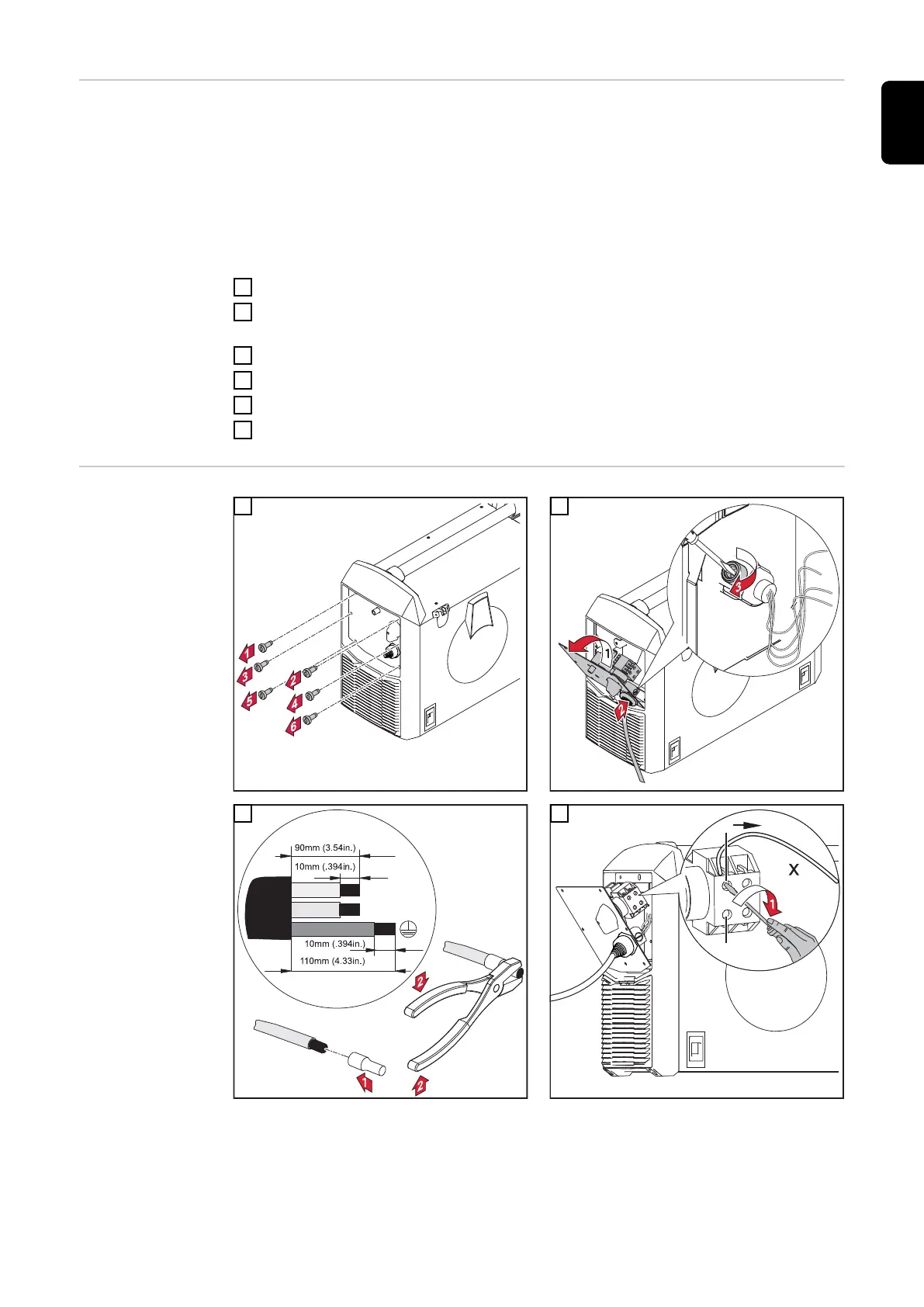 The ground conductor should be approx. 10 - 15 mm (0.4 - 0.6 in.) longer than the phase