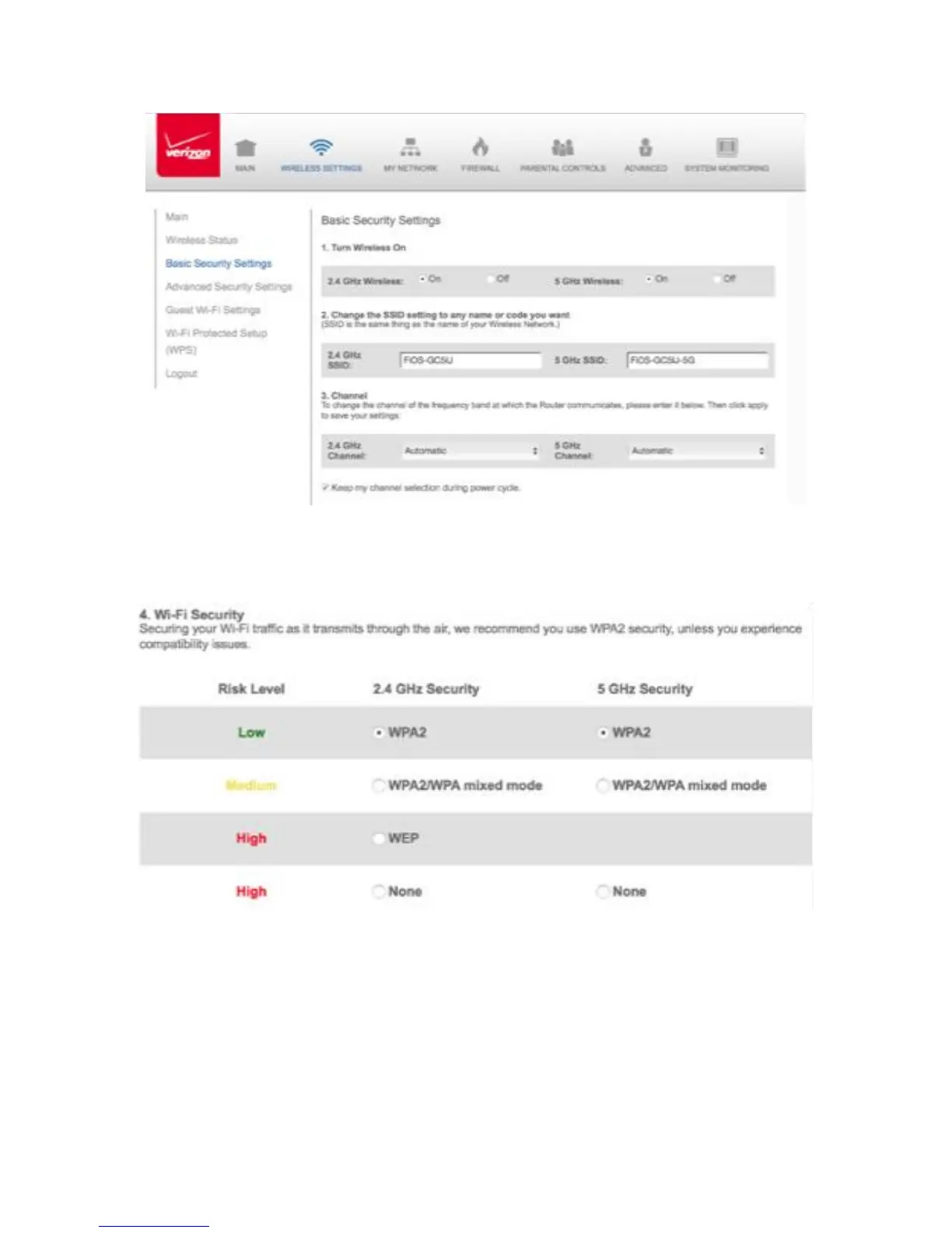 Frontier fios - To Configure the Basic Security Radio, SSID and Channel Settings