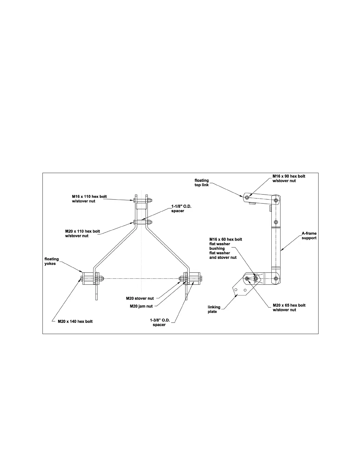 6. Attach the A-frame support to the floating top link using the M16x110 bolt with stover